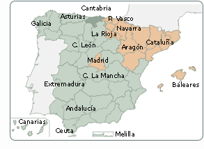 En el mapa adjunto se observa la División de las regiones españolas en zonas de Objetivo 1(con retrasos en su desarrollo con respecto a la media europea, nivel de renta inferior al 75% de la media europea) y fuera de Objetivo 1 (en mejor situación que las anteriores).