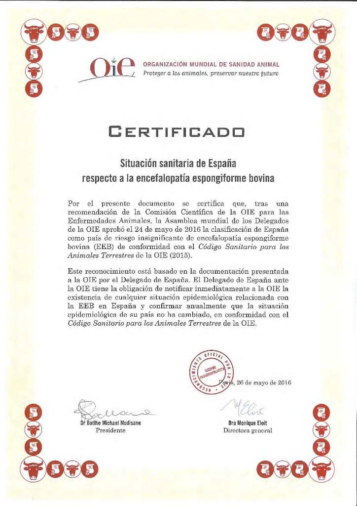 En la 84ª Sesión General de la Asamblea Mundial de la OIE celebrada en mayo de 2016, la Organización Mundial de Sanidad Animal reconoció oficialmente a España como país cuyo riesgo de EEB es insignificante. España goza del estatus sanitario de país con riesgo insignificante de EEB en el marco internacional. (Resolución nº20 OIE 2016