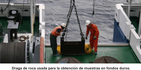 La navegación se realizó con GPS-Diferencial. Se efectuaron medidas periódicas de velocidad del sonido en el agua (SV-Plus), se realizaron dragas de arrastre y dragas shipeck.