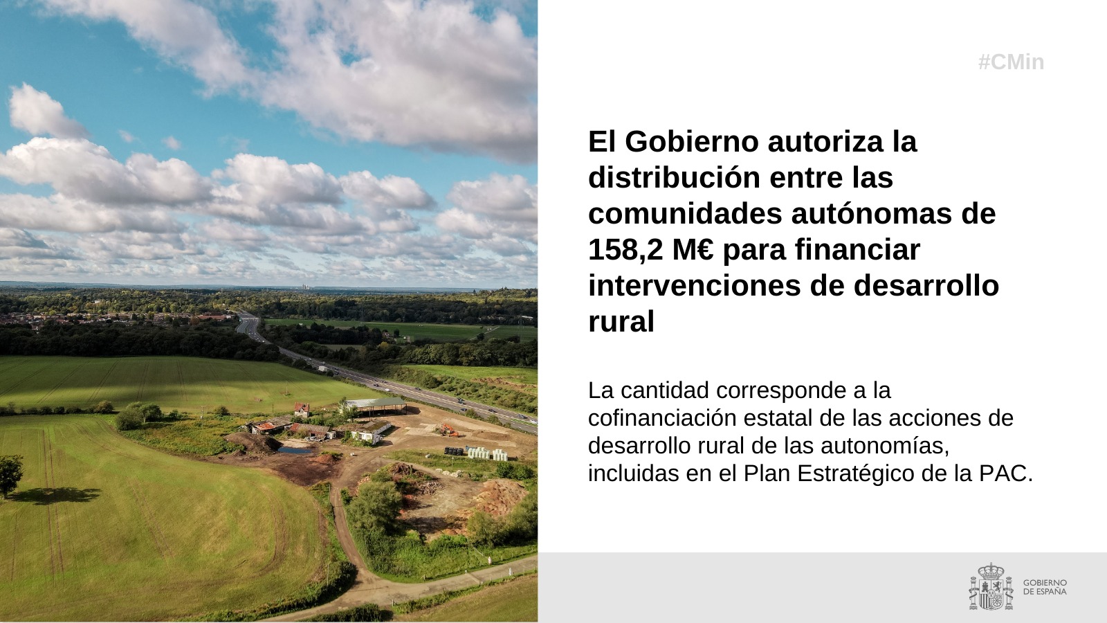 El Consejo de Ministros ha autorizado hoy la distribución territorial entre las comunidades autónomas de un crédito por 158.225.557 euros para financiar intervenciones de desarrollo rural contempladas en el Plan Estratégico Nacional de la Política Agraria Común (PAC) 2023-2027