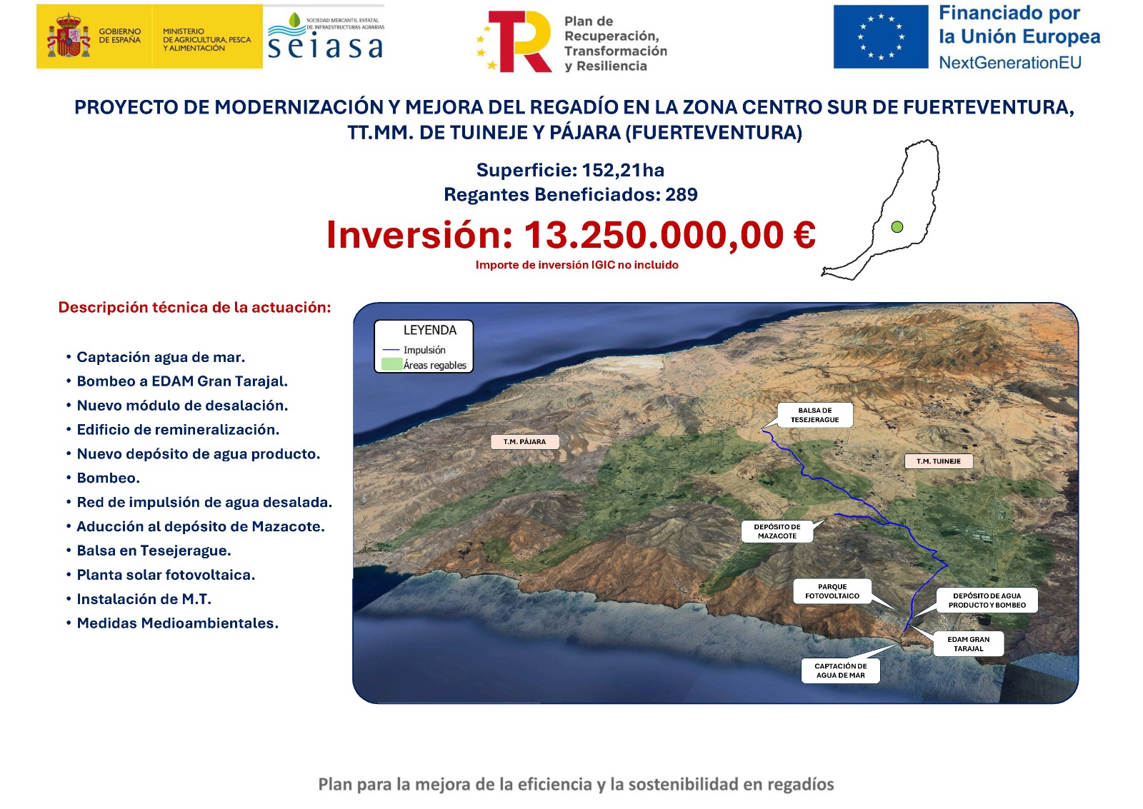 El Ministerio de Agricultura, Pesca y Alimentación, a través de la Sociedad Mercantil Estatal de Infraestructuras Agrarias (Seiasa) impulsa en la actualidad el uso de aguas procedentes de fuentes no convencionales en regadíos de la isla de Fuerteventura, mediante una actuación que cuenta con una inversión de 13.250.000 euros (Impuesto General Indirecto Canario no incluido) con cargo al Plan de Recuperación, Transformación y Resiliencia.