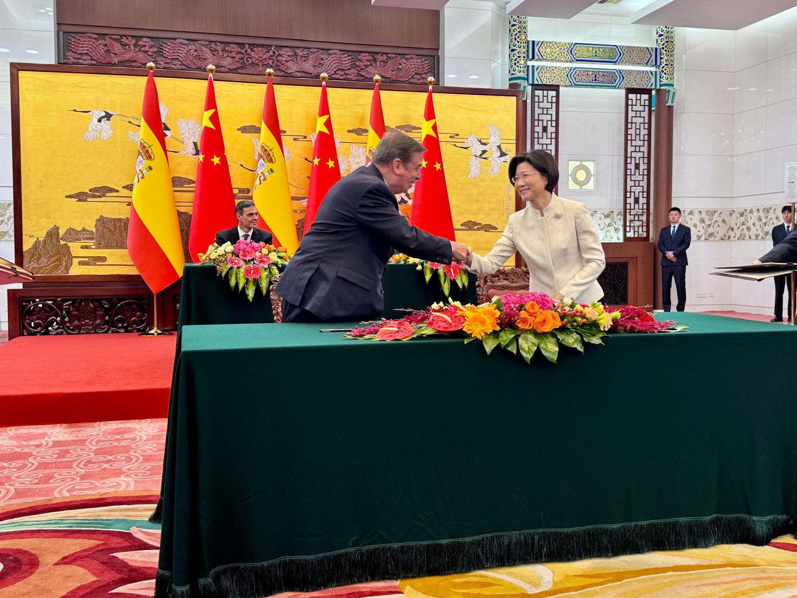 El ministro de Agricultura, Pesca y Alimentación, Luis Planas y la ministra de la Administración General de Aduanas de China, Sun Meijun, han firmado dos nuevos protocolos para exportar cerezas y porcino al país asiático en el marco del viaje oficial que el presidente del Gobierno realiza estos días a China. Dos acuerdos suscritos por los gobiernos español y chino que aumentan la capacidad exportadora de estos dos sectores españoles.
