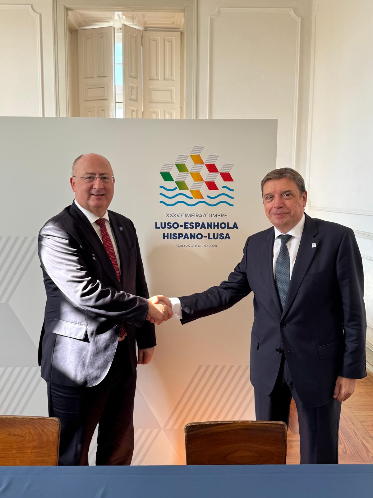 El ministro de Agricultura, Pesca y Alimentación, Luis Planas, y el de Agricultura y Pesca de Portugal, José Manuel Fernandez, han repasado hoy algunos de los principales asuntos en los que ambos países tienen intereses comunes y han coincidido en situar las sequías recurrentes que afectan con mayor incidencia en algunas zonas de la Península ibérica, los problemas derivados del cambio climático y el futuro de la Política Agraria Común (PAC) como prioridades para la nueva legislatura europea.