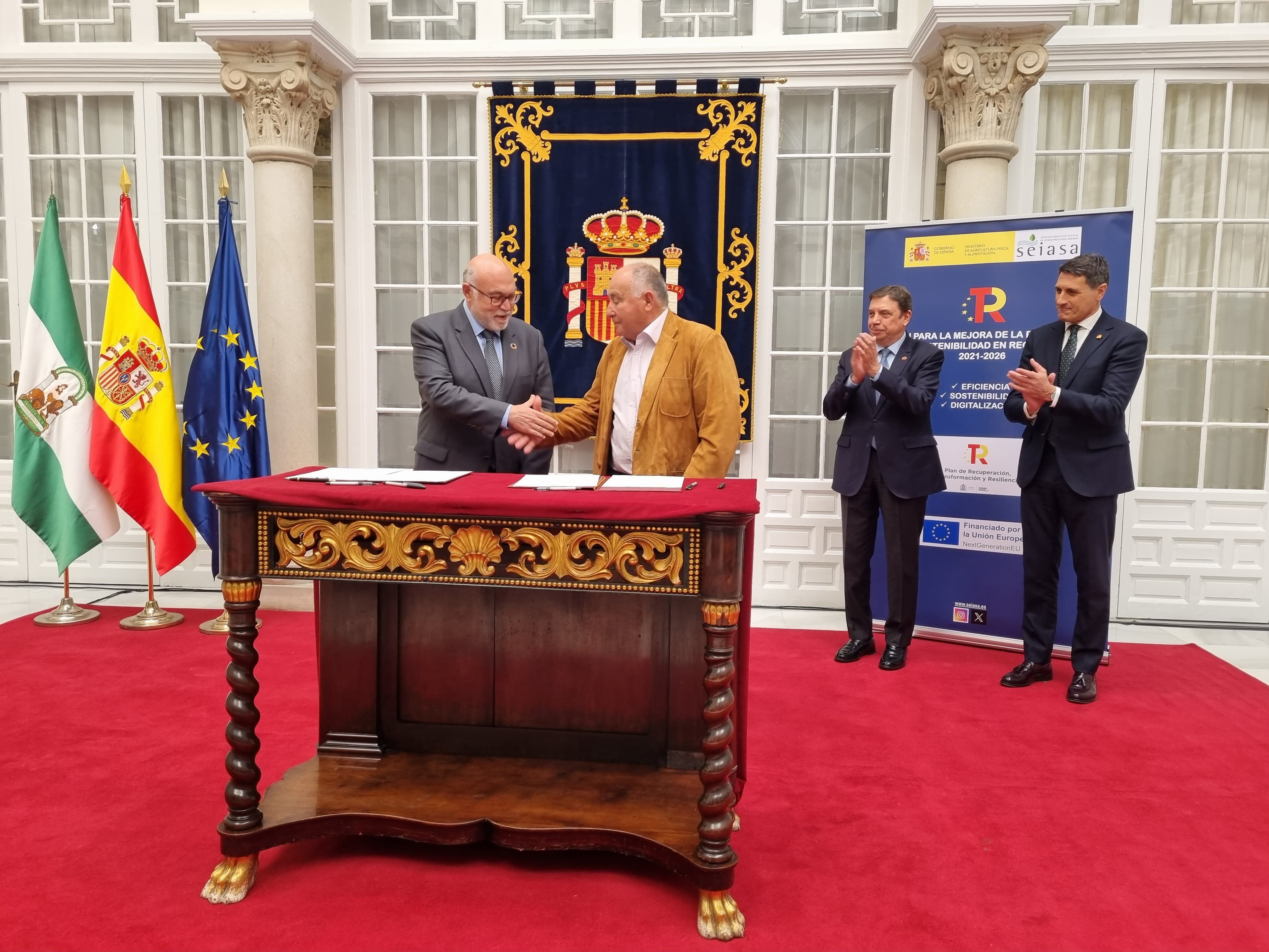Luis Planas ha asistido hoy, en Sevilla, a la firma de tres convenios destinados a la modernización de regadíos en la Comunidad de Regantes de las Marismas del Guadalquivir (Sevilla) y a poner en marcha instalaciones de energía renovable en la Junta Central de Usuarios del Sur del Guaro y en la Comunidad de Regantes Cerro de la Encina, ambas en la provincia de Málaga.