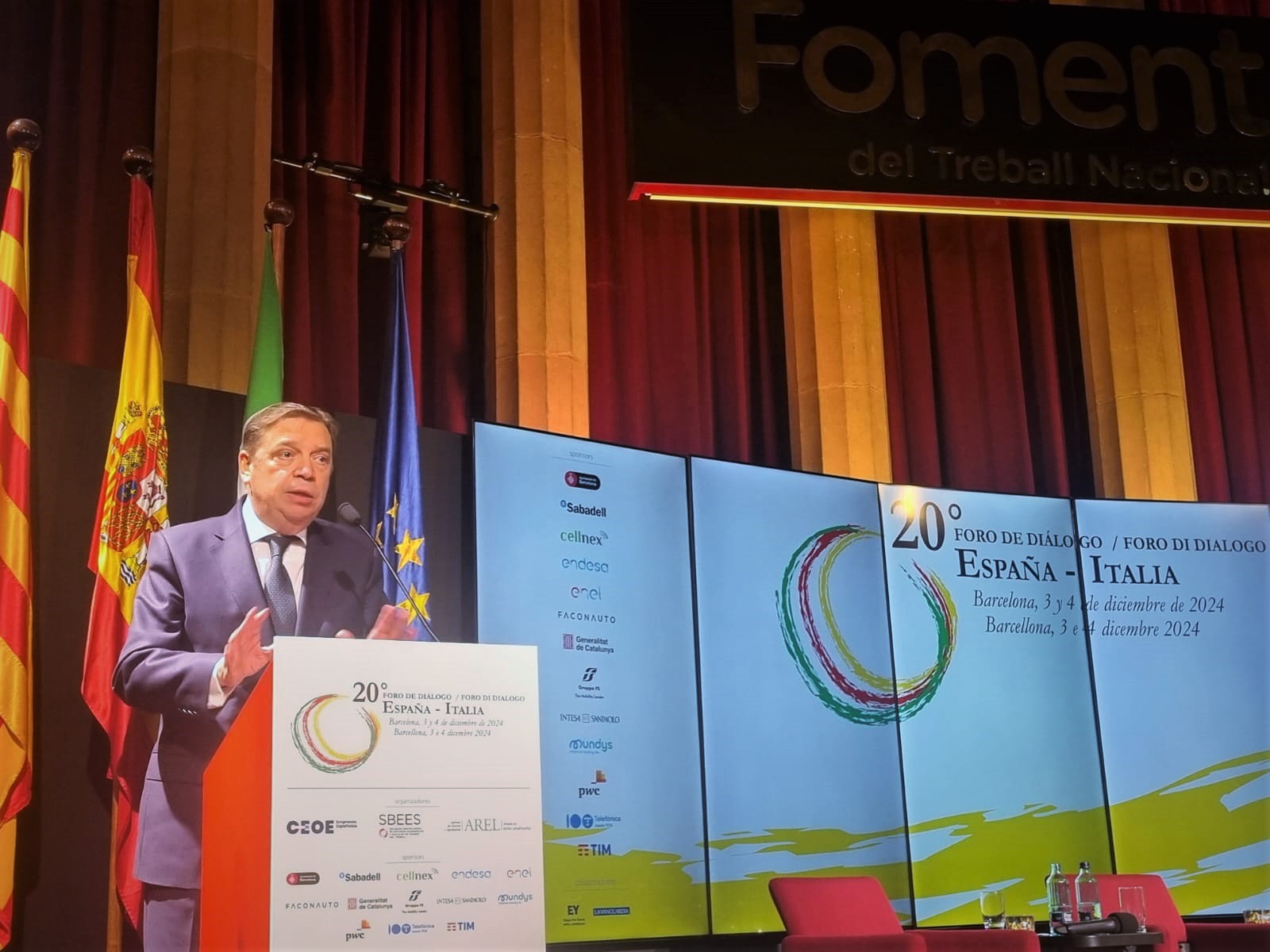 Luis Planas ha intervenido hoy, en Barcelona, en el XX Foro de Diálogo España-Italia, organizado por Foment del Treball, en el que también ha participado el ministro de Agricultura, Soberanía Alimentaria y Silvicultura de Italia, Francesco Lollobrigida. Con carácter anual, este encuentro reúne a altos cargos institucionales de los gobiernos de ambos países y a representantes de los ámbitos político, académico, empresarial, económico y de la comunicación.