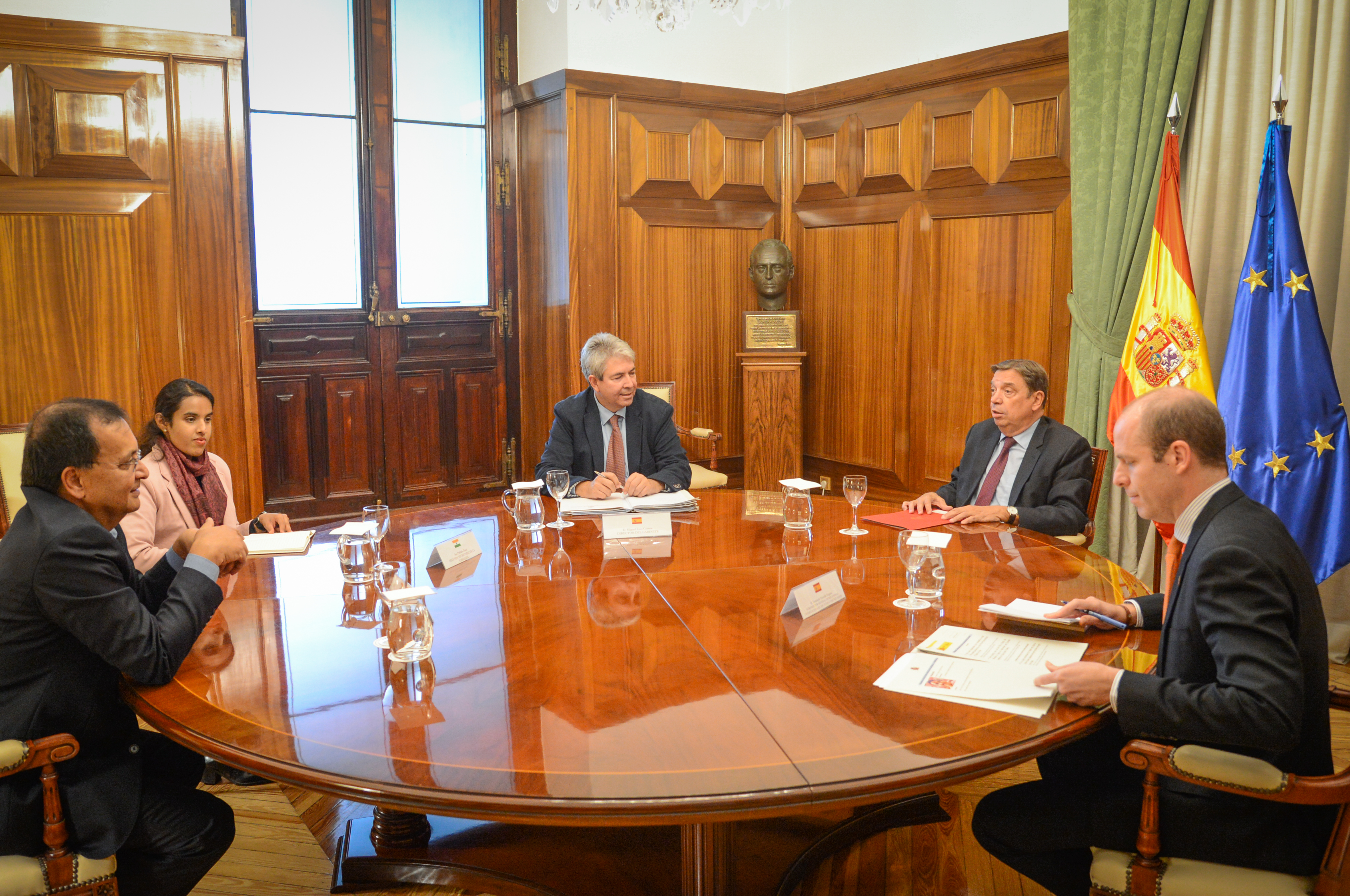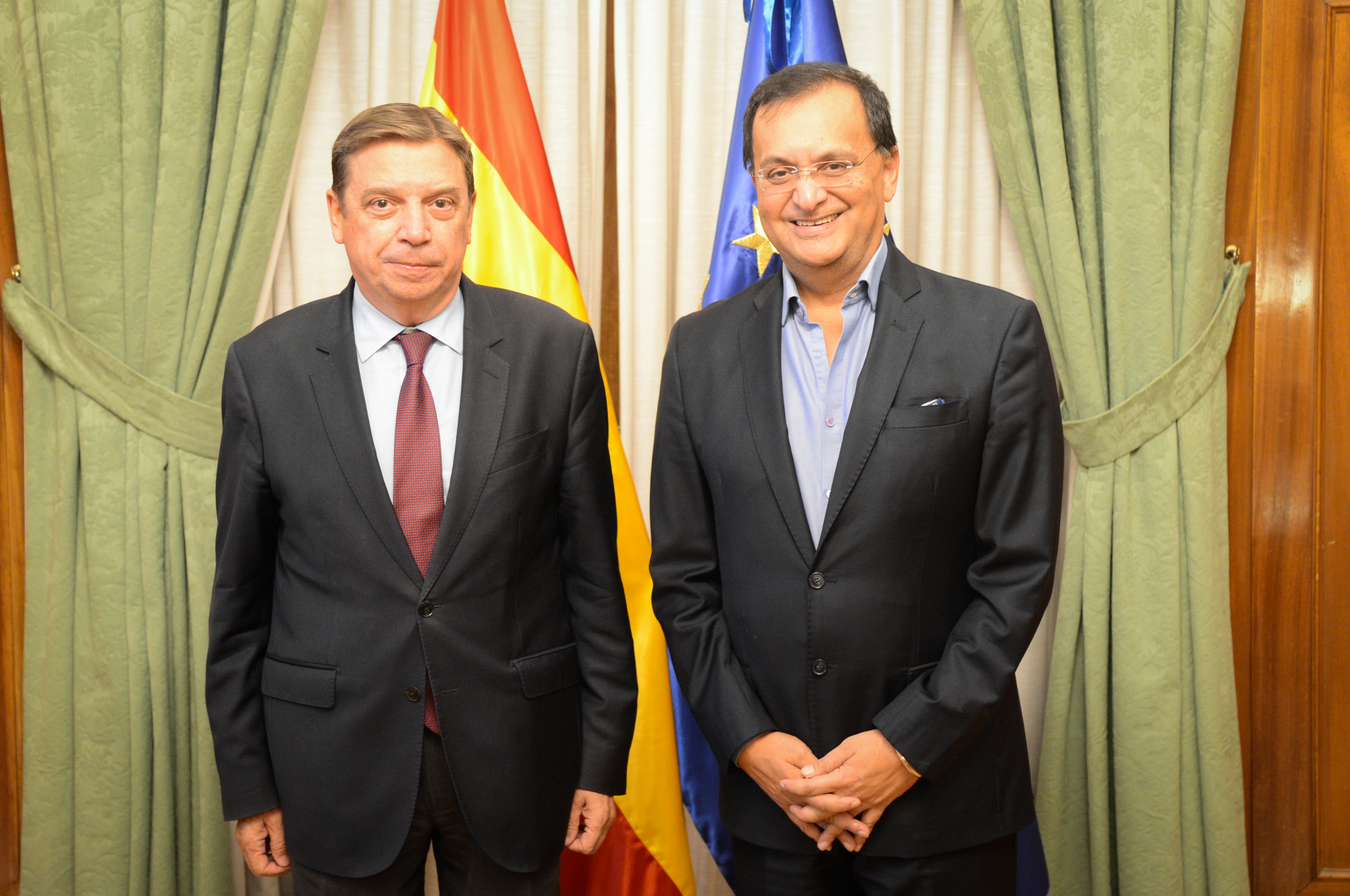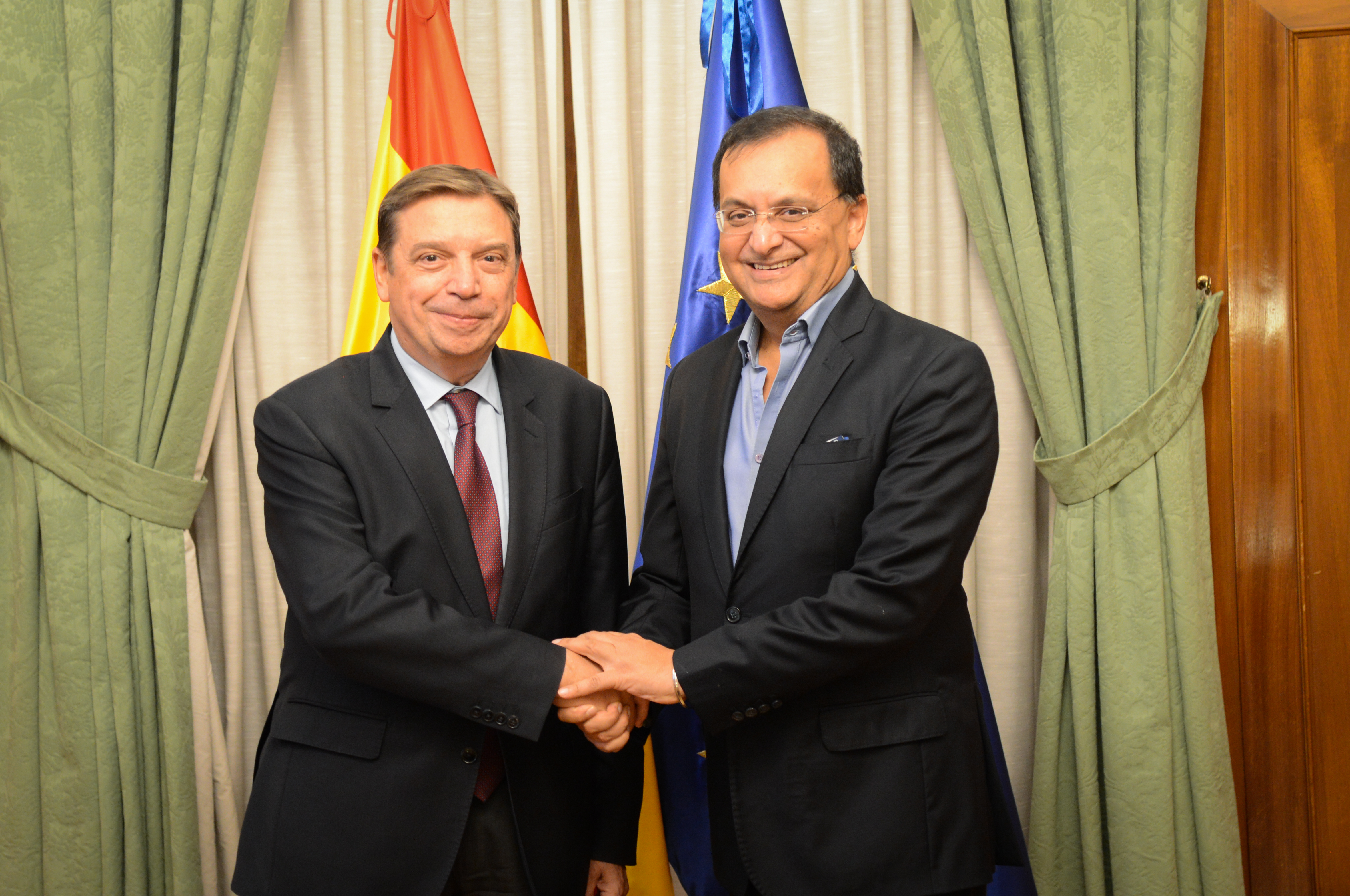 El ministro de Agricultura, Pesca y Alimentación, Luis Planas, ha compartido hoy con el embajador de la India en España, Dinesh Kumar Patnaik, la oportunidad de fortalecer las relaciones bilaterales y el comercio agroalimentario entre ambos países. Patnaik se ha mostrado particularmente interesado en la tecnología agroalimentaria española, sobre todo, la relacionada con los regadíos y la agricultura de precisión.