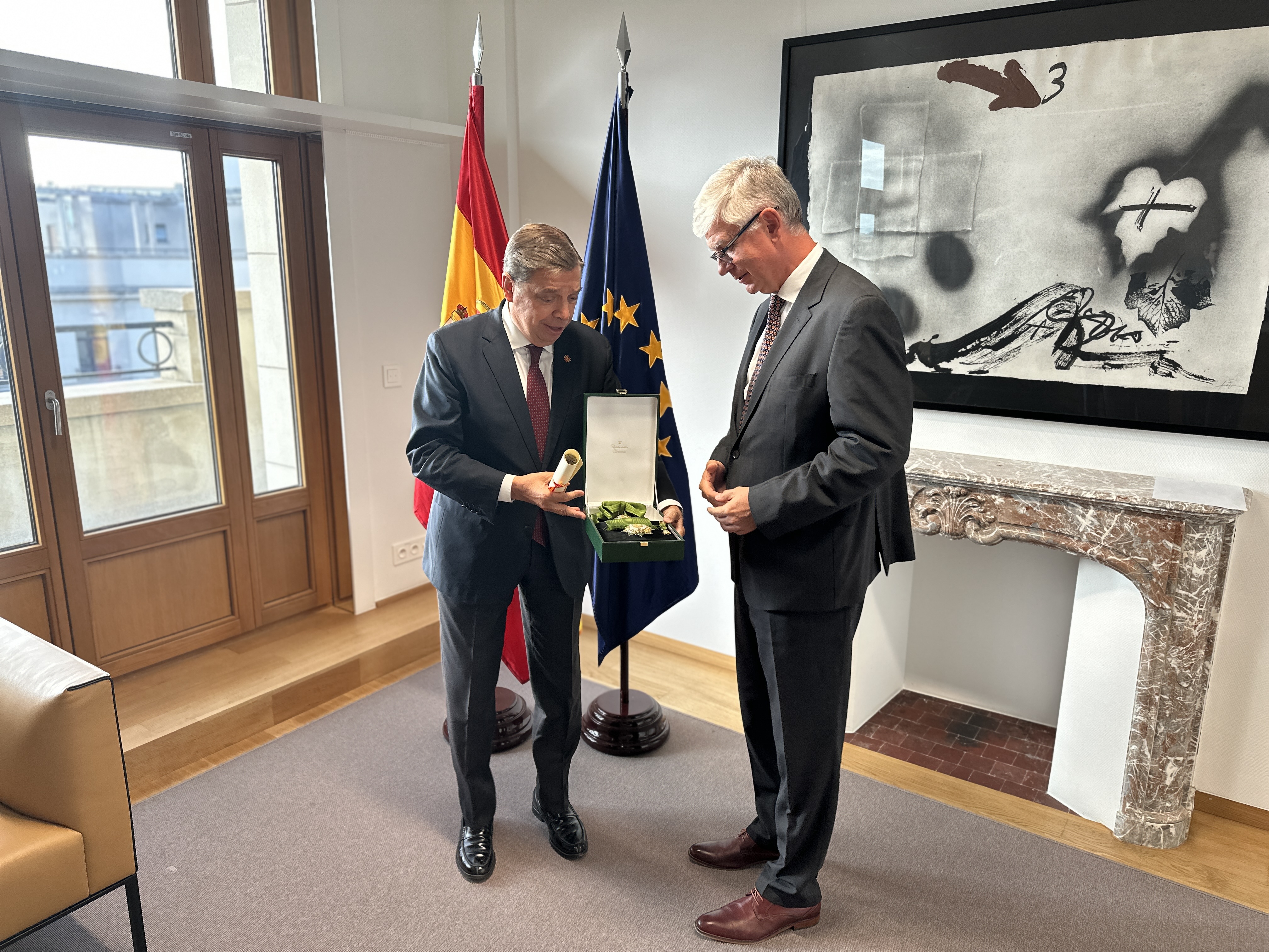 El ministro de Agricultura, Pesca y Alimentación, Luis Planas, ha entregado hoy la Gran Cruz de la Orden Civil del Mérito Agrario, Pesquero y Alimentario al director de Pesca de la Secretaría General del Consejo de la Unión Europea, Iván Gábor, un galardón que estaba previsto que recogiera en julio del año pasado en un acto al que no pudo asistir.