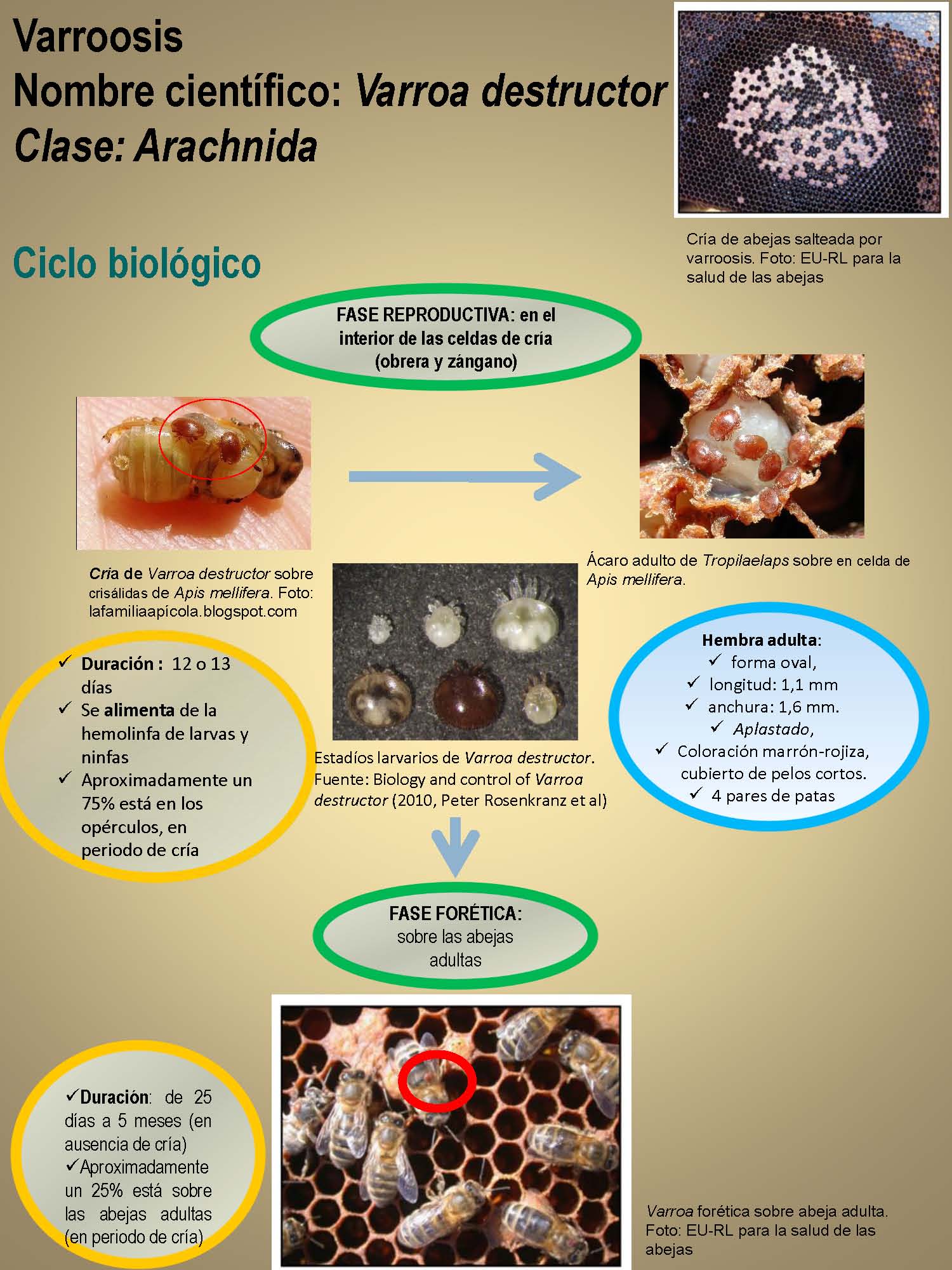 El ciclo completo del ácaro ocurre dentro de las colmenas e implica su alimentación tanto de las abejas adultas (fase forética) como de la cría (fase reproductiva). La fase reproductiva comienza cuando, una o más hembras adultas grávidas, se introducen en una celda de cría con larva justo antes de ser operculada, donde Varroa tiene una mayor preferencia por las celdillas de cría de zángano. Allí se quedan debajo del alimento larval hasta que la celdilla es sellada. En un periodo de 60 horas después del proceso de operculado de la celda, el ácaro deposita su primer huevo, del que sale un macho, a partir de entonces pondrá un huevo cada 30 horas de los que nacerán sólo hembras. La larva de Varroa resultante comienza a desarrollarse pasando por los estadios de protoninfa, deutoninfa y finalmente a adulto. Una vez alcanzado el estado de adulto, el macho y las hembras se aparean dentro de las celdillas.