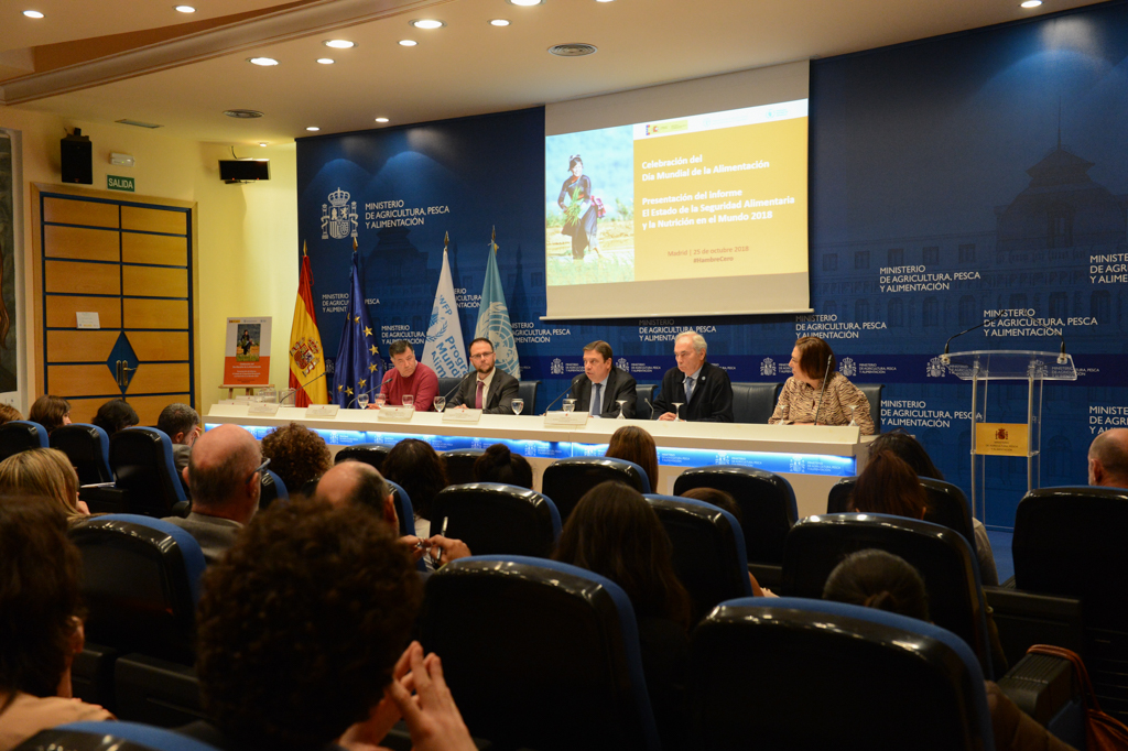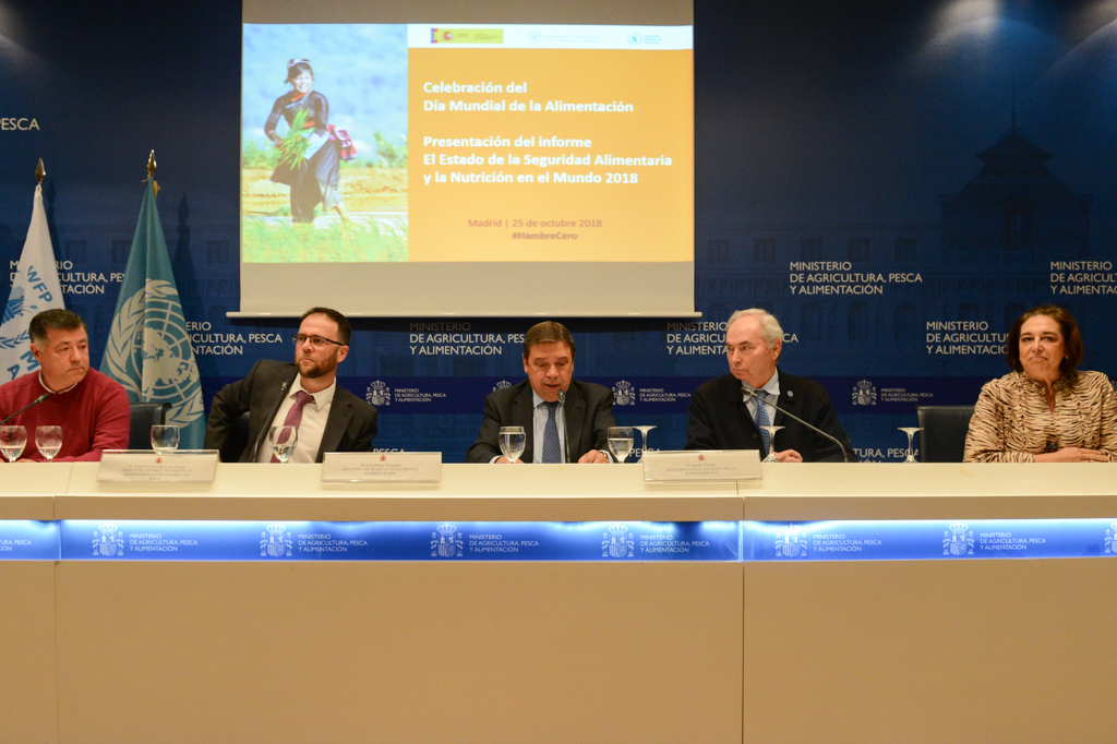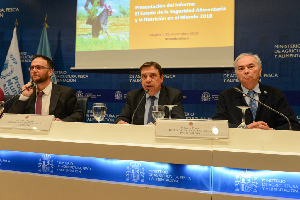 El ministro de Agricultura, Pesca y Alimentación, Luis Planas, ha clausurado hoy el acto de presentación del Informe SOFI 2018, elaborado por la Organización de las Naciones Unidas para la Alimentación y la Agricultura (FAO), el Programa Mundial de Alimentos (WFP), el Fondo Internacional de Desarrollo Agrícola (FIDA), UNICEF y la Organización Mundial de la Salud (OMS), sobre el estado de la seguridad alimentaria y la nutrición en el mundo. El informe de este año relaciona los resultados con los desafíos de la Agenda 2030 para el Desarrollo Sostenible, especialmente con el Objetivo de Desarrollo Sostenible 2 (Hambre Cero).
