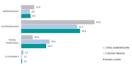 El supermercado es el canal preferido por los españoles para adquirir estas frutas, que concentran el 54,5 % de las compras. Entre las frutas frescas adquiridas en este tipo de establecimiento, el melón y la sandía destacan como las más demandadas. Le siguen las tiendas tradicionales con el 23,3 % del volumen total y el hipermercado como tercer canal de distribución.