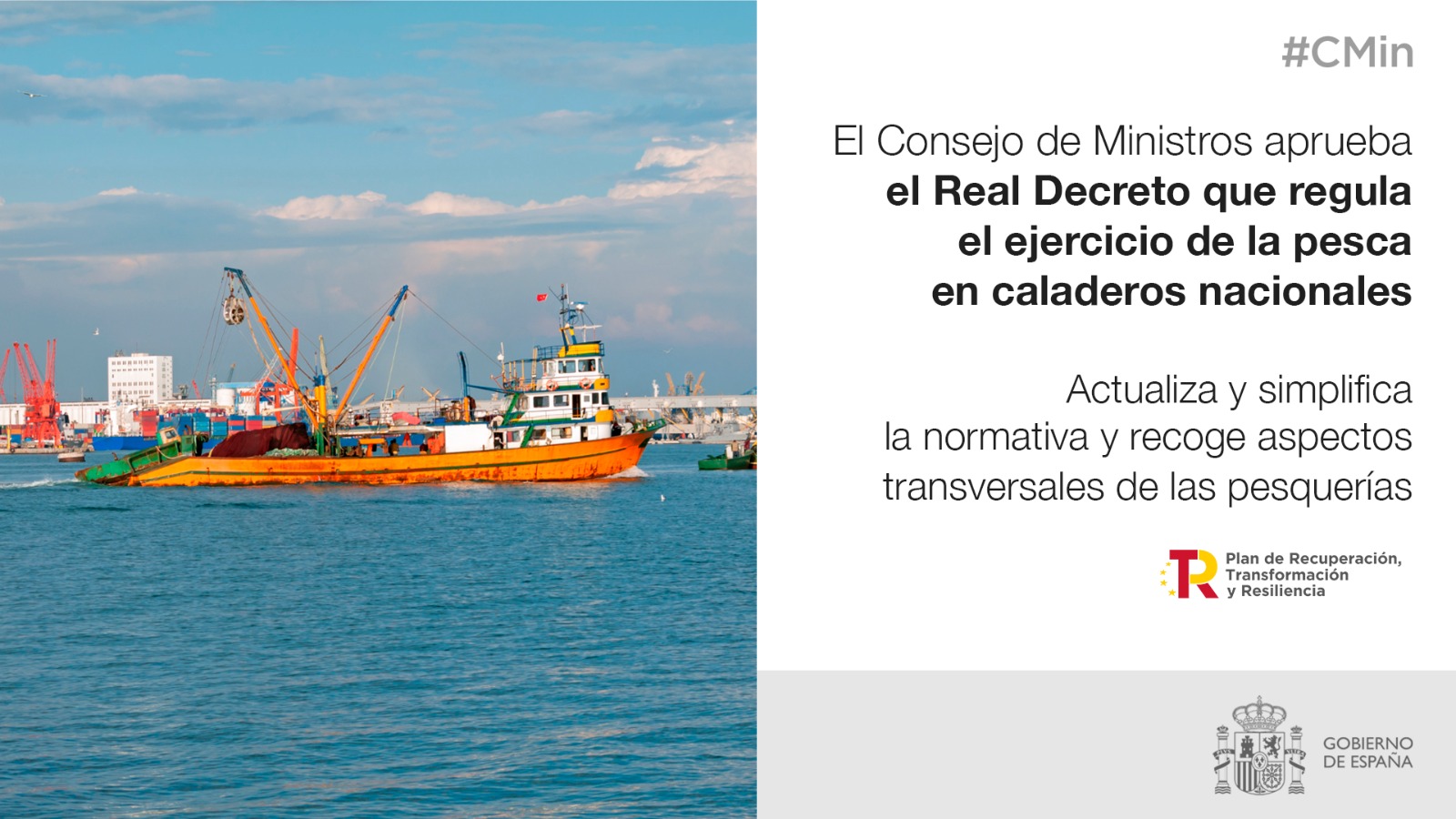 El Gobierno ha aprobado hoy, en Consejo de Ministros, un real decreto por el que se regula el ejercicio de la pesca en los caladeros nacionales peninsulares, con lo que se da cumplimiento a uno de los elementos incluidos como hito en el Plan de Recuperación, Transformación y Resiliencia (PRTR) al unificar la ordenación en la materia, que hasta ahora estaba muy dispersa en diferentes normas.