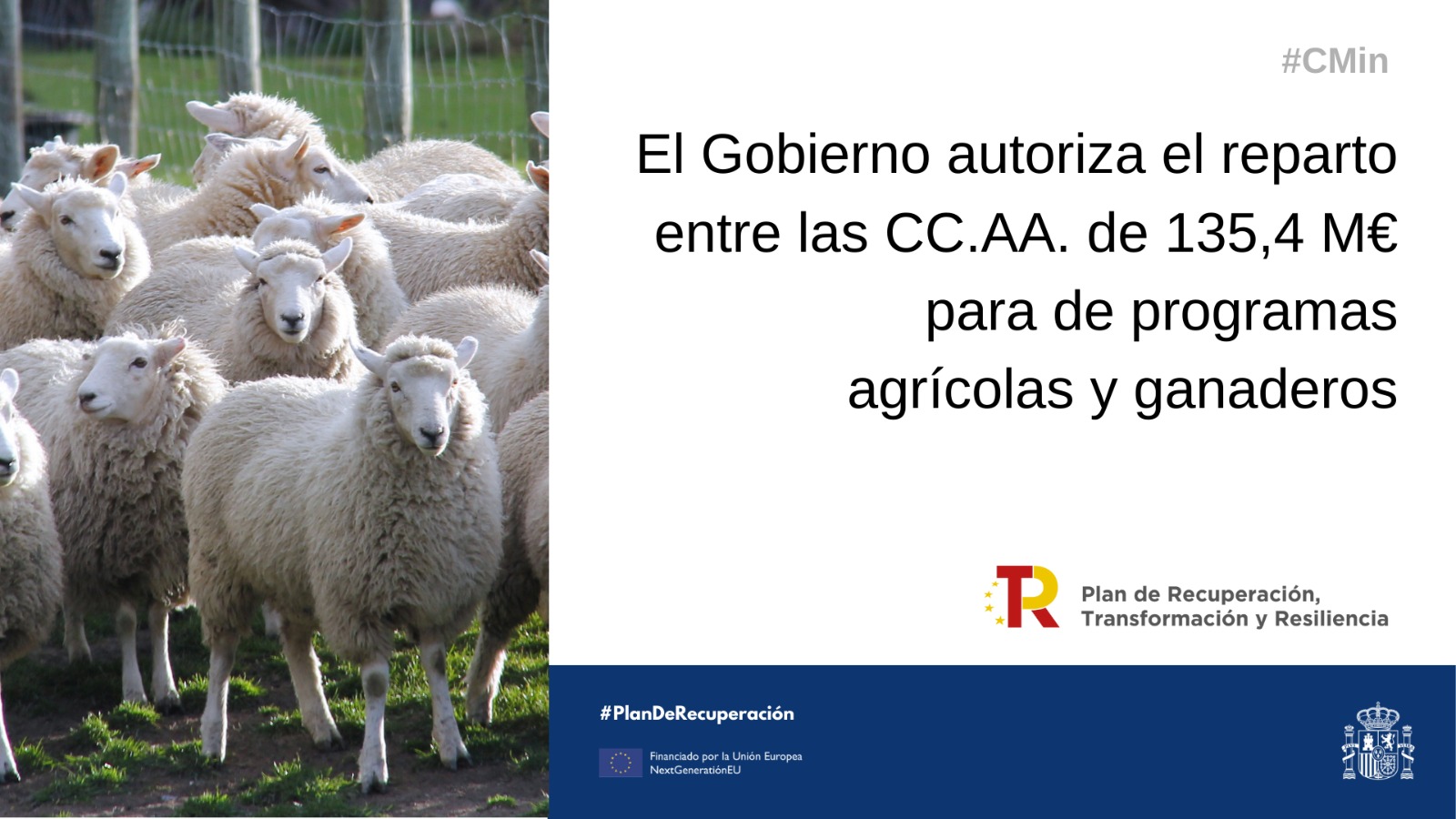 El Consejo de Ministros, a propuesta del Ministerio de Agricultura, Pesca y Alimentación, ha autorizado la distribución territorial entre las comunidades autónomas de 135,4 millones de euros para la financiación de distintos programas en materia agrícola y ganadera. De los dos paquetes de fondos, el más cuantioso, por importe de 114.541.247,28 corresponden a la concesión de ayudas enmarcadas en el Plan Nacional de Recuperación, Transformación y Resiliencia (PRTR).