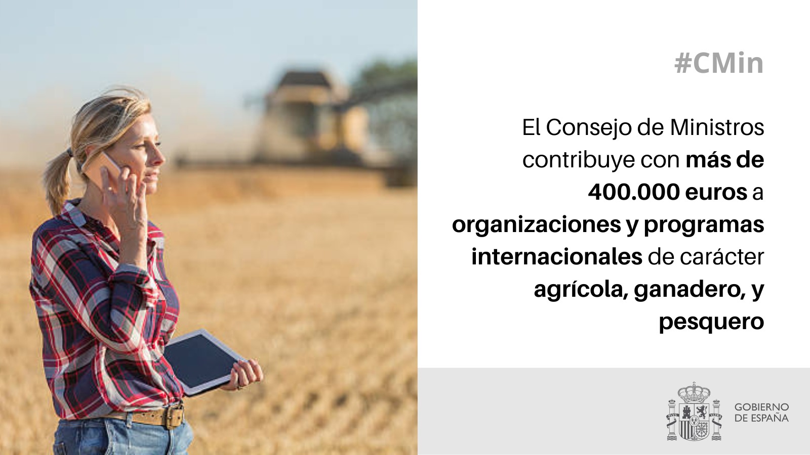 El Consejo de Ministros ha autorizado hoy al Ministerio de Agricultura, Pesca y Alimentación a realizar seis contribuciones que suman un total de 415.641 euros a distintos organismos y programas internacionales de carácter agrícola, ganadero, y pesquero, que se consideran de interés para España.
