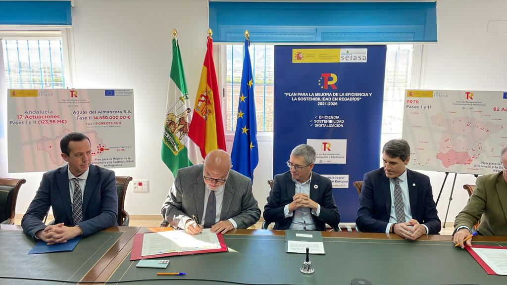 El convenio firmado hoy es el segundo con cargo a los fondos de la denominada Fase II del Plan de Recuperación, Transformación y Resiliencia (PRTR) en el marco del plan para la mejora y eficiencia de la sostenibilidad en regadíos en Andalucía.