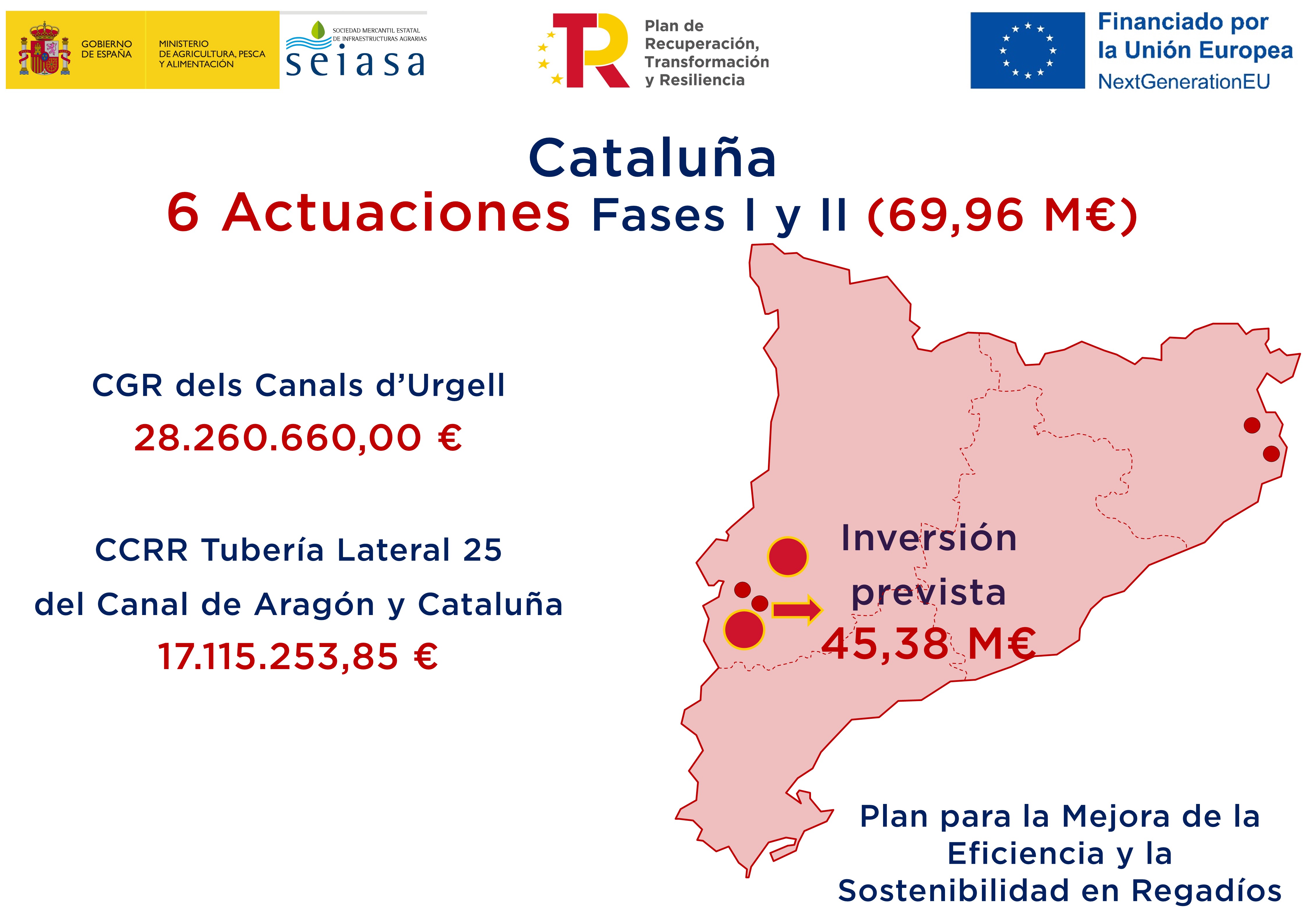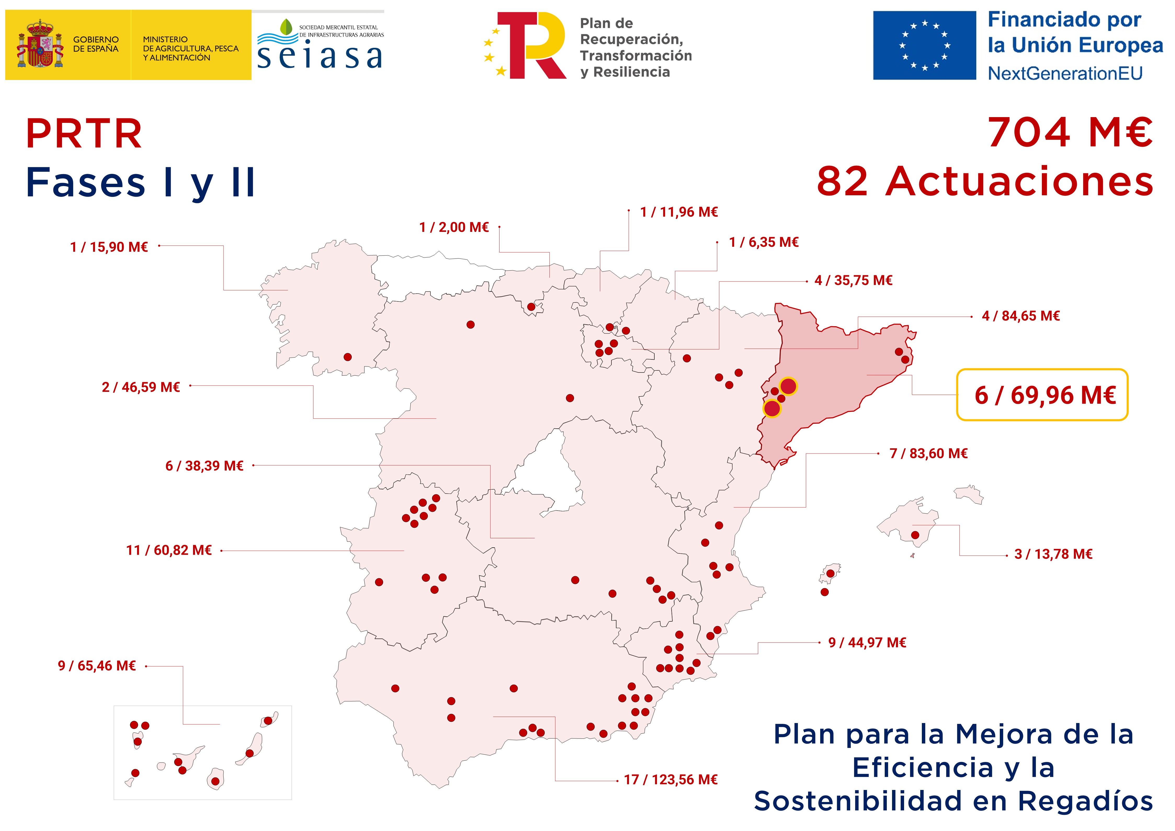 En el conjunto de Cataluña, el Ministerio de Agricultura, Pesca y Alimentación, a través de SEIASA, va a destinar 69,96 millones de euros del Plan de Recuperación, Transformación y Resiliencia, a la modernización de regadíos sostenibles.