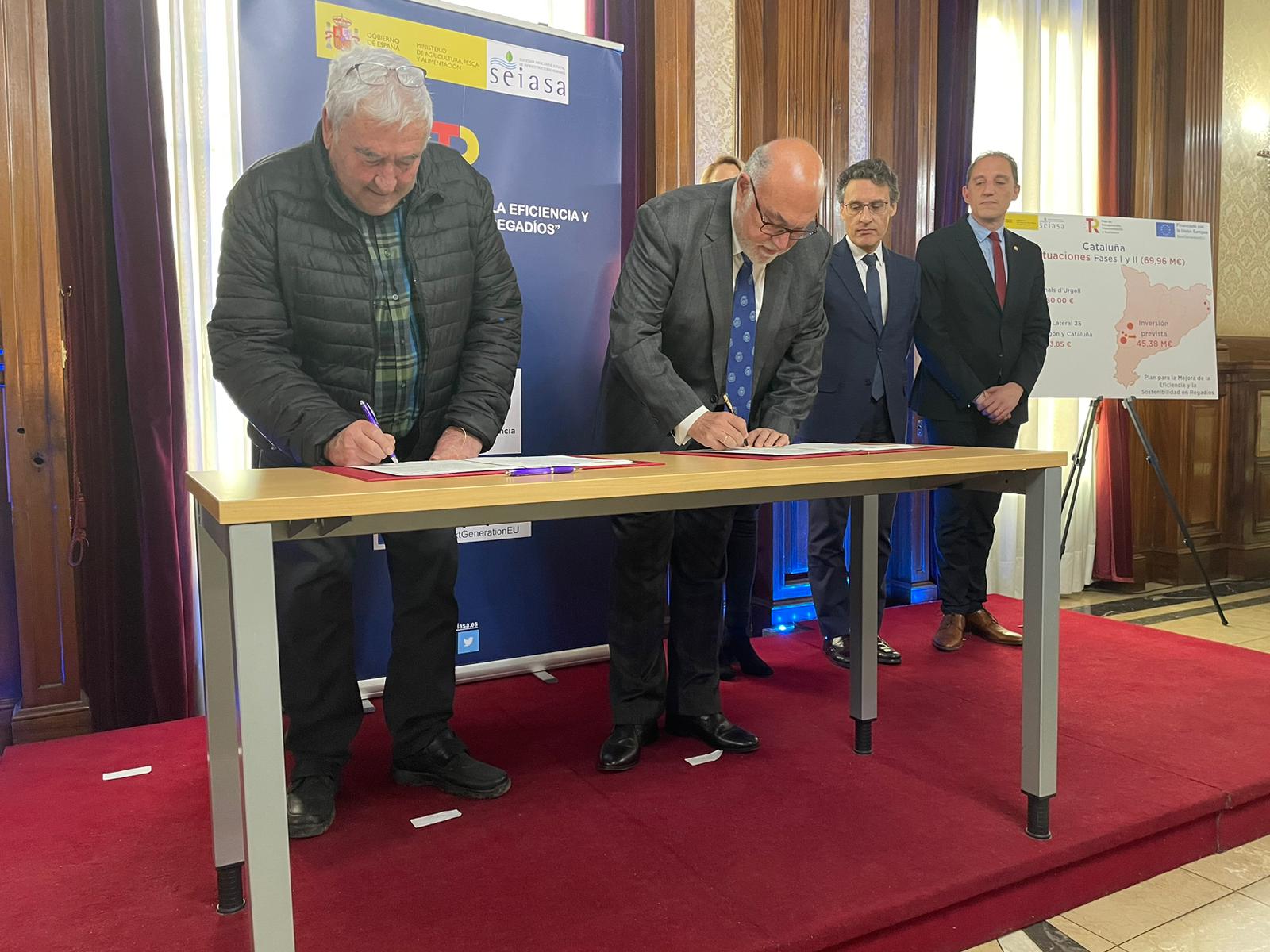 El secretario general de Agricultura y Alimentación, Fernando Miranda, ha asistido hoy, en Lleida, a la firma de los convenios correspondientes a los dos proyectos incluidos en la Fase II del PRTR, suscritos entre el presidente de SEIASA, Francisco Rodríguez Mulero, y los representantes de la Comunidad General de Regantes de Canals D’Urgell (Lleida) y de las comunidades de regantes integradas en la denominada Tubería 25, dentro de la Comunidad General de Regantes del Canal de Aragón y Cataluña: Vincamet-Vilaró, Litera-Persio, Serós, Litera-Vincamet y Serrabrisa Montfret (Huesca y Lleida).