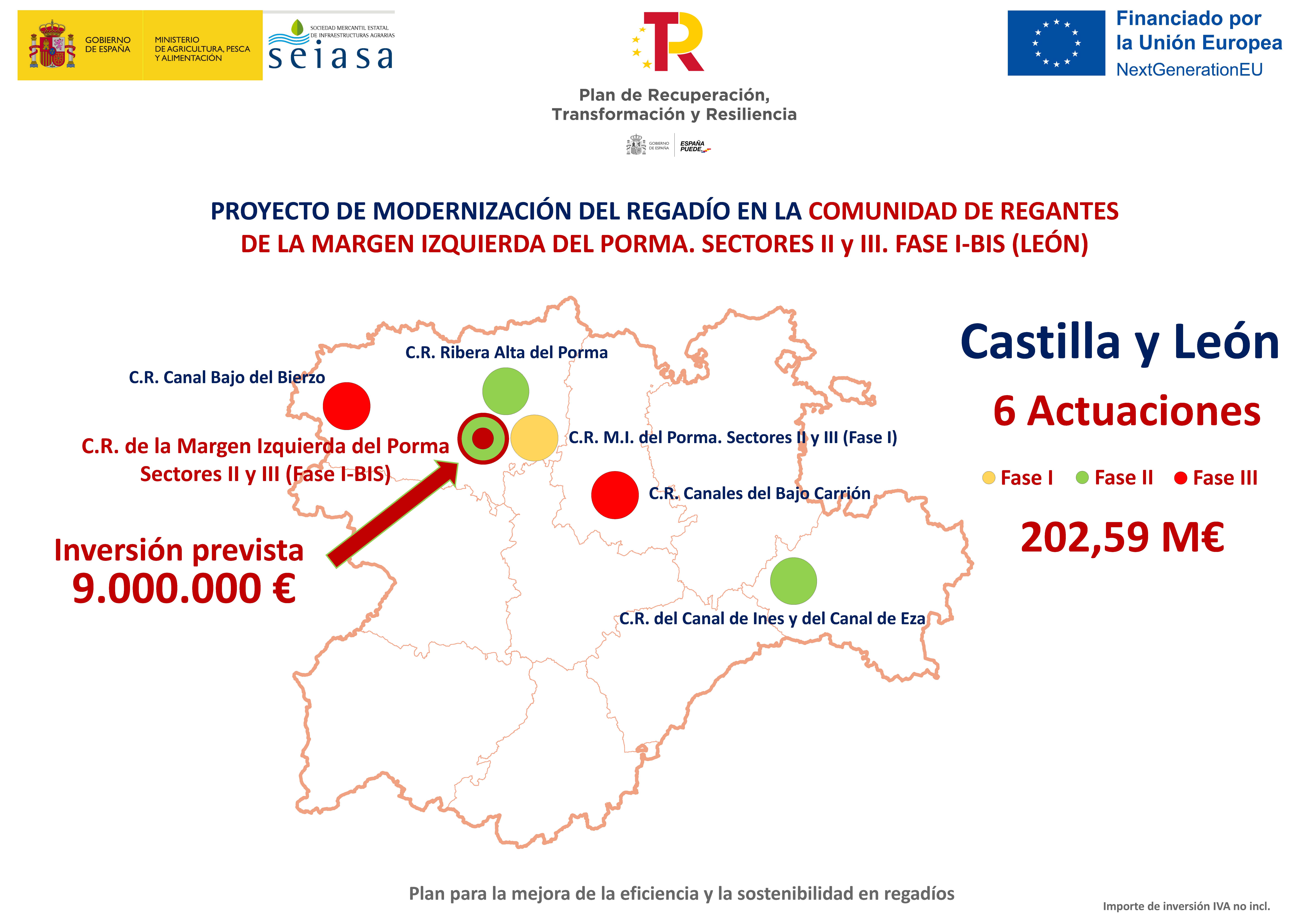Ambos convenios van a contar con una financiación de 67 millones de euros, de los que 58 millones corresponden al proyecto de la Ribera Alta del Porma, Fase I y los otros 9 millones al proyecto de modernización de regadío de la Margen Izquierda del Porma. Sectores II y III. Fase I-Bis. Ambas iniciativas van a permitir reemplazar el sistema actual de acequias por una nueva red de riego mediante tuberías a presión hasta las parcelas, más eficiente. También está previsto dotar a ambas comunidades con un moderno sistema de telecontrol que permita gobernar el riego de manera integral.