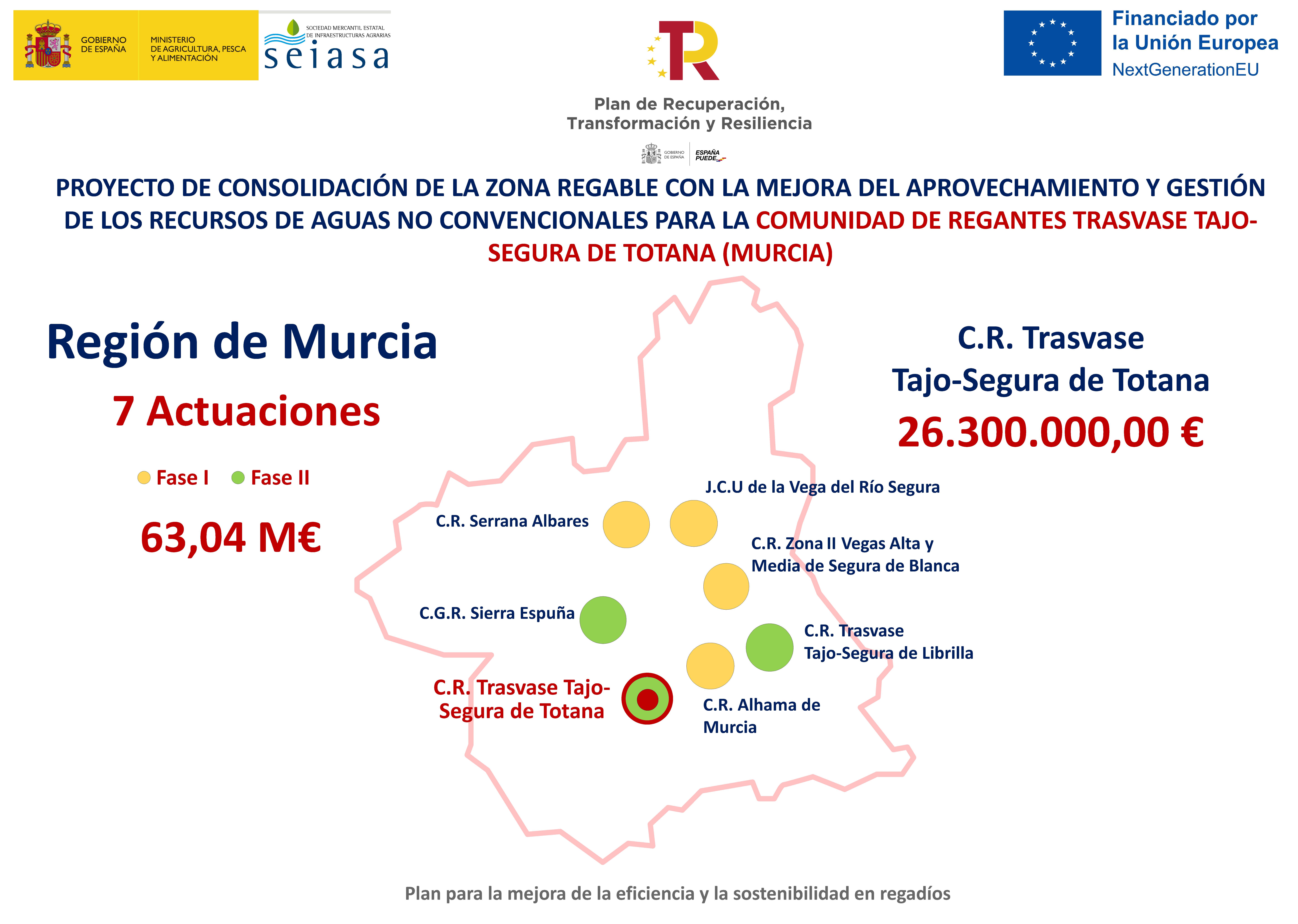 El proyecto de consolidación de la zona regable con la mejora del aprovechamiento y gestión de los recursos de aguas no convencionales para la comunidad de regantes Trasvase Tajo-Segura de Totana (Murcia) tiene por objeto consolidar el uso para el riego de aguas no convencionales procedentes de las desalinizadoras de Águilas y Torrevieja. Para ello se construirán dos nuevas balsas de acumulación y las conducciones y bombeos correspondientes.