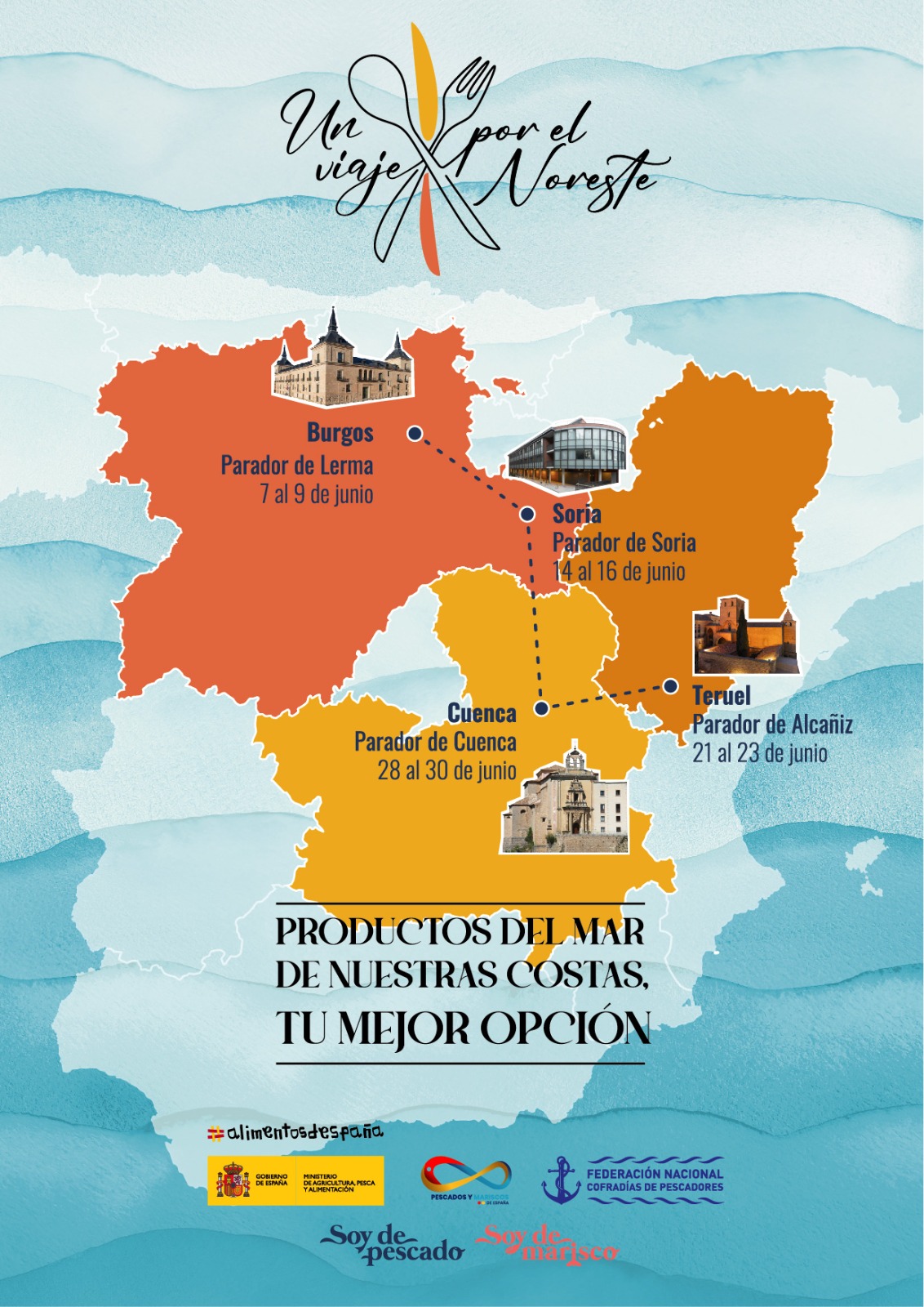 Uno de estos acuerdos es el suscrito con la Federación Nacional de Cofradías de Pescadores para poner en marcha distintas acciones de promoción en mercados de abastos, escuelas de hostelería y cadenas de restauración, bajo el lema “Los productos del mar de nuestras costas, tu mejor opción”. Durante el mes de junio se realizarán jornadas gastronómicas en los paradores nacionales de turismo de Lerma (Burgos, del 7 al 9 de junio), Soria (15-16), Alcañiz (Teruel, 21-23) y Cuenca (28-30).