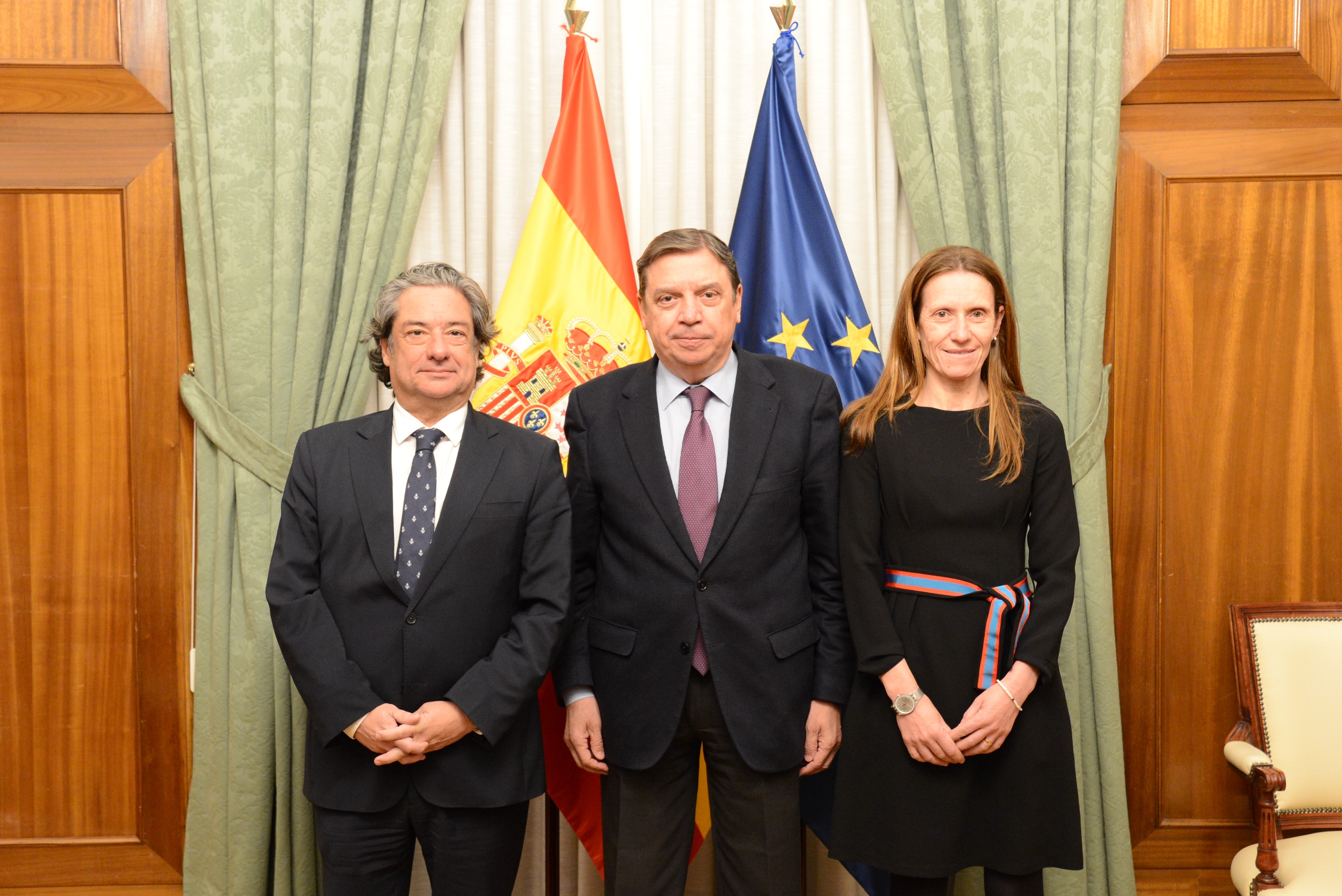 El ministro de Agricultura, Pesca y Alimentación, Luis Planas, se ha reunido hoy, en la sede del ministerio, con el nuevo presidente Conxemar, Eloy García Alvariza, y con la directora general, Yobana Bermúdez, a quienes ha reiterado el apoyo del ministerio en su tarea de impulsar la competitividad del sector pesquero y acuícola. El ministro ha puesto de relieve el esfuerzo que realiza cada año esta organización para organizar y financiar el Congreso Conxemar – FAO y la feria de productos del mar, un encuentro de referencia internacional que cuenta con la presencia institucional del Ministerio de Agricultura, Pesca y Alimentación.