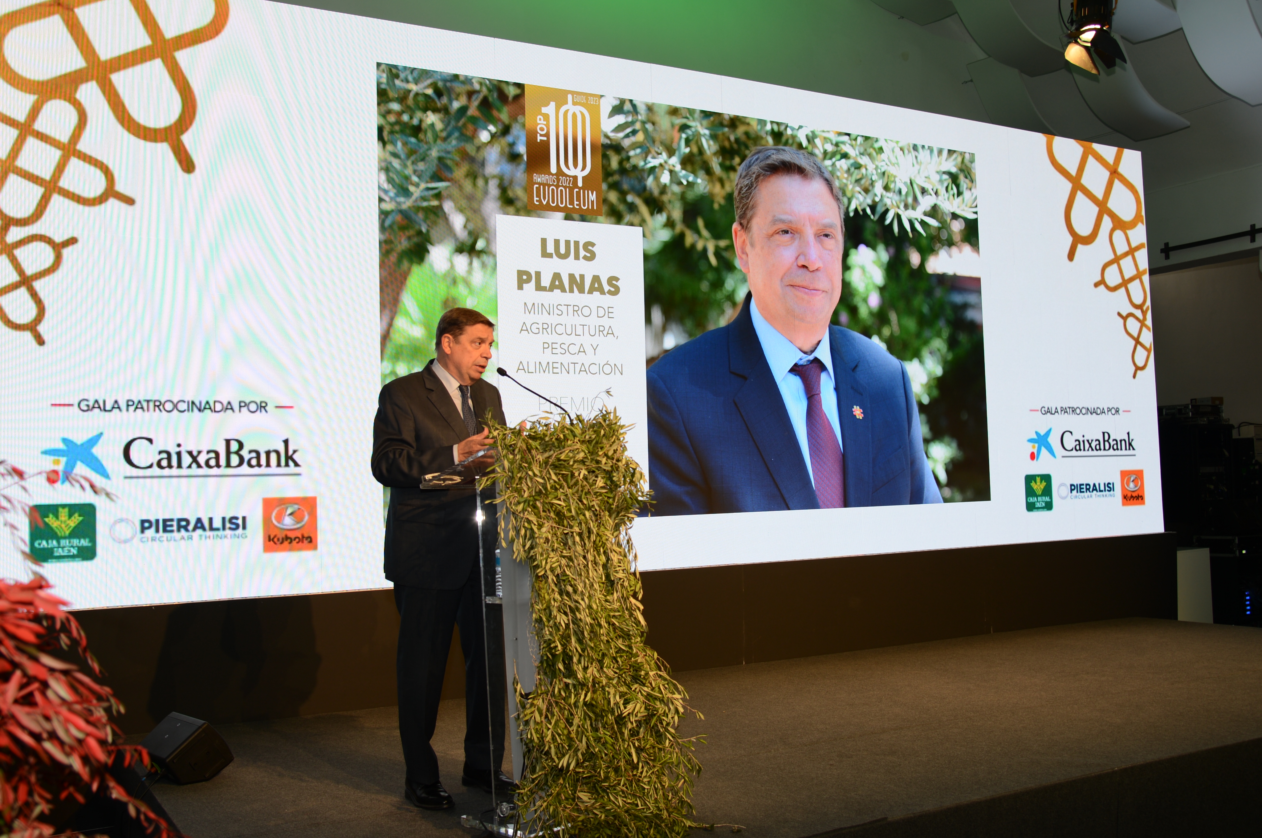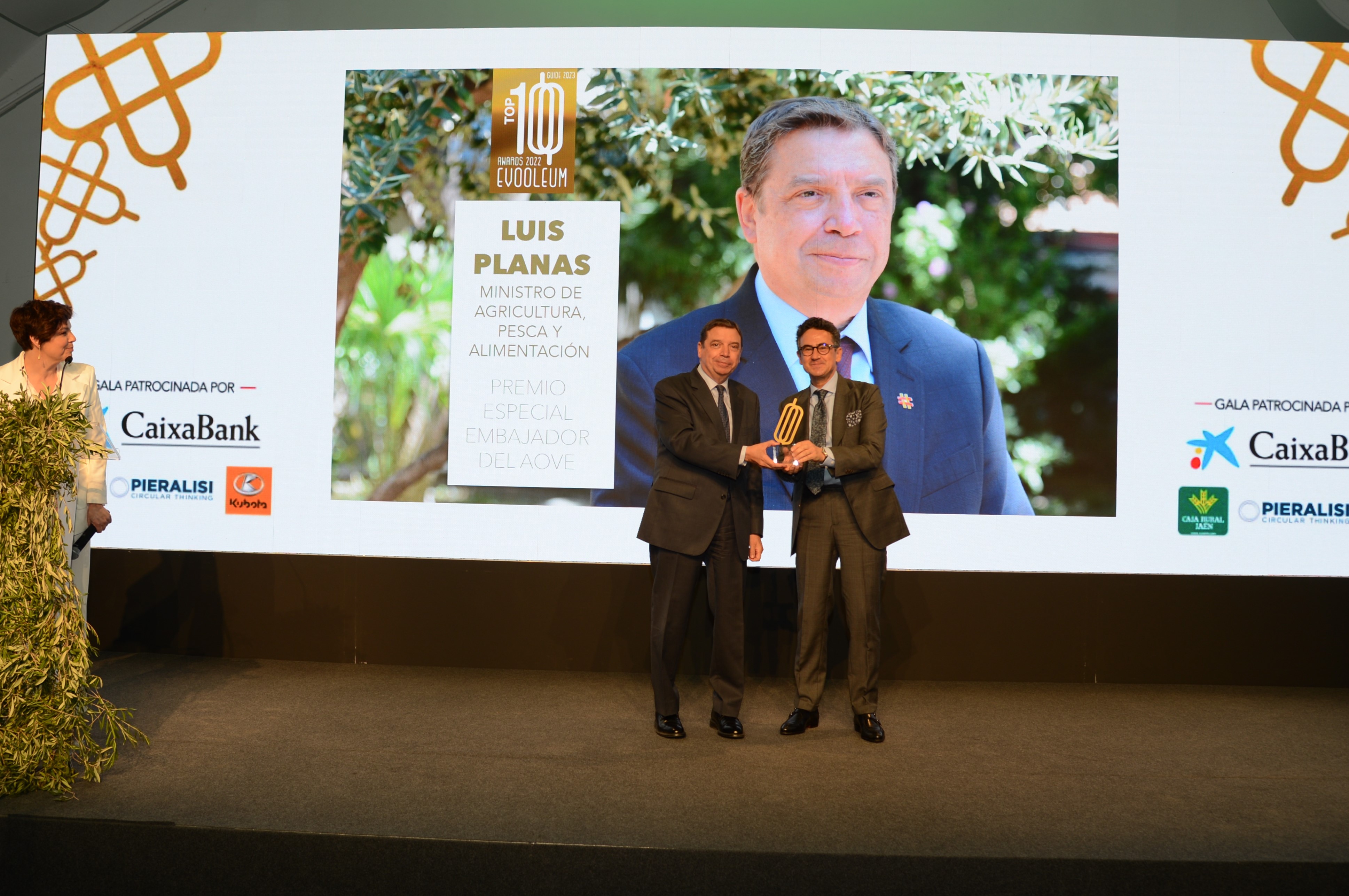 Luis Planas ha recibido el premio Embajador del Aceite de Oliva Virgen Extra que concede Evooleum en reconocimiento a la promoción de este producto y al apoyo al sector oleícola. En su agradecimiento, el ministro señalado que se siente muy afortunado por poder contribuir, desde su responsabilidad, al crecimiento y expansión del sector y que recibe la distinción como un estímulo para continuar la labor de promoción de un producto tan señero para España como el aceite de oliva. En anteriores ediciones obtuvieron esta distinción los chefs María José San Román y Diego Guerrero y la directora de cine Isabel Coixet.