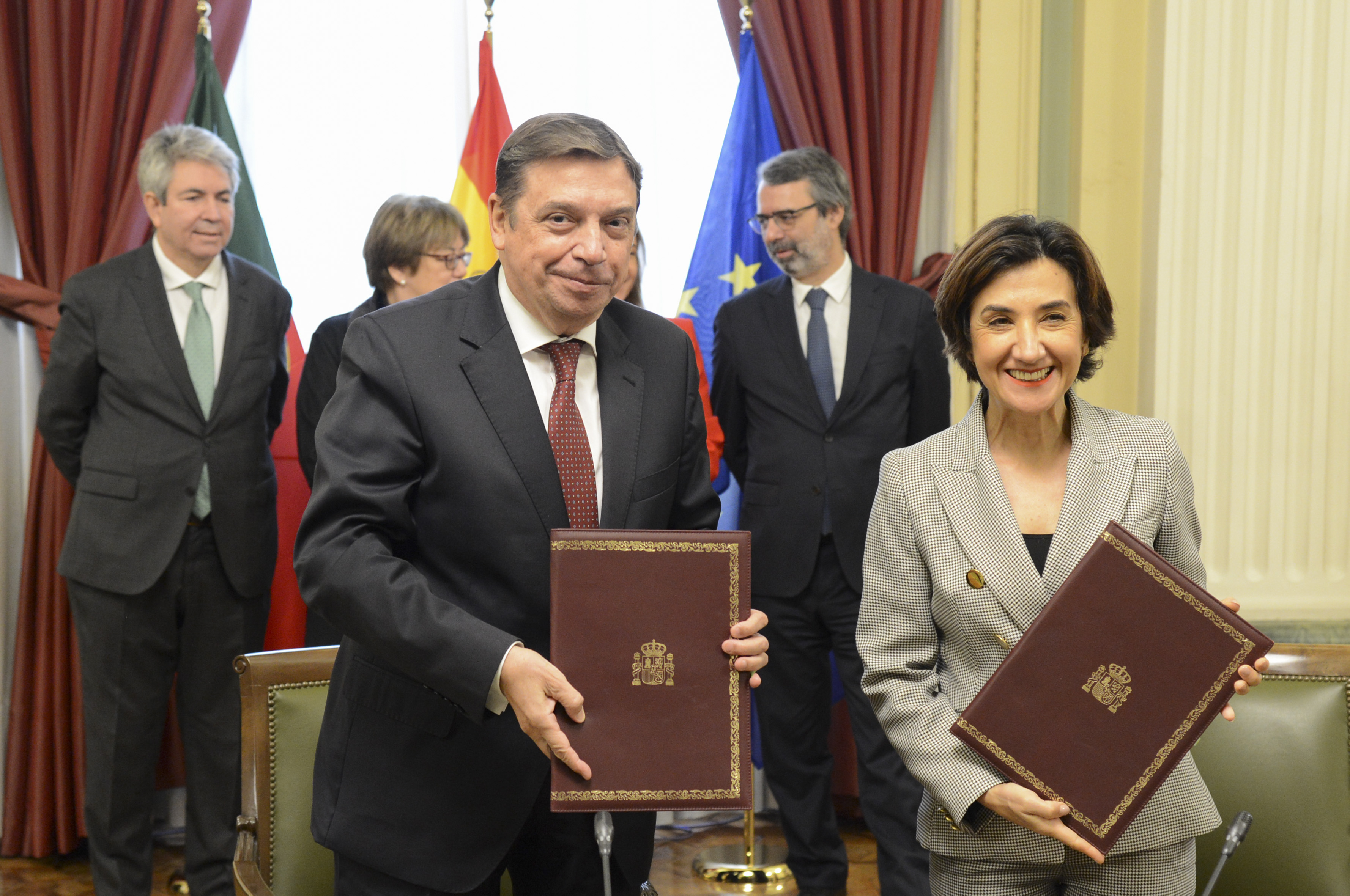 Luis Planas se ha reunido hoy, en la sede del ministerio, con la ministra de Agricultura y Alimentación de Portugal, María do Céu Antunes, con quien ha repasado los principales temas de interés común en materia agroalimentaria y pesquera de ambos países y han abordado posibles vías para estrechar la colaboración ibérica. Ambos ministros han mostrado una gran sintonía y complicidad para llevar adelante los asuntos que les preocupan, porque la “norma ibérica” entre los dos países significa cooperación, apoyo mutuo y amistad, ha remarcado Planas.