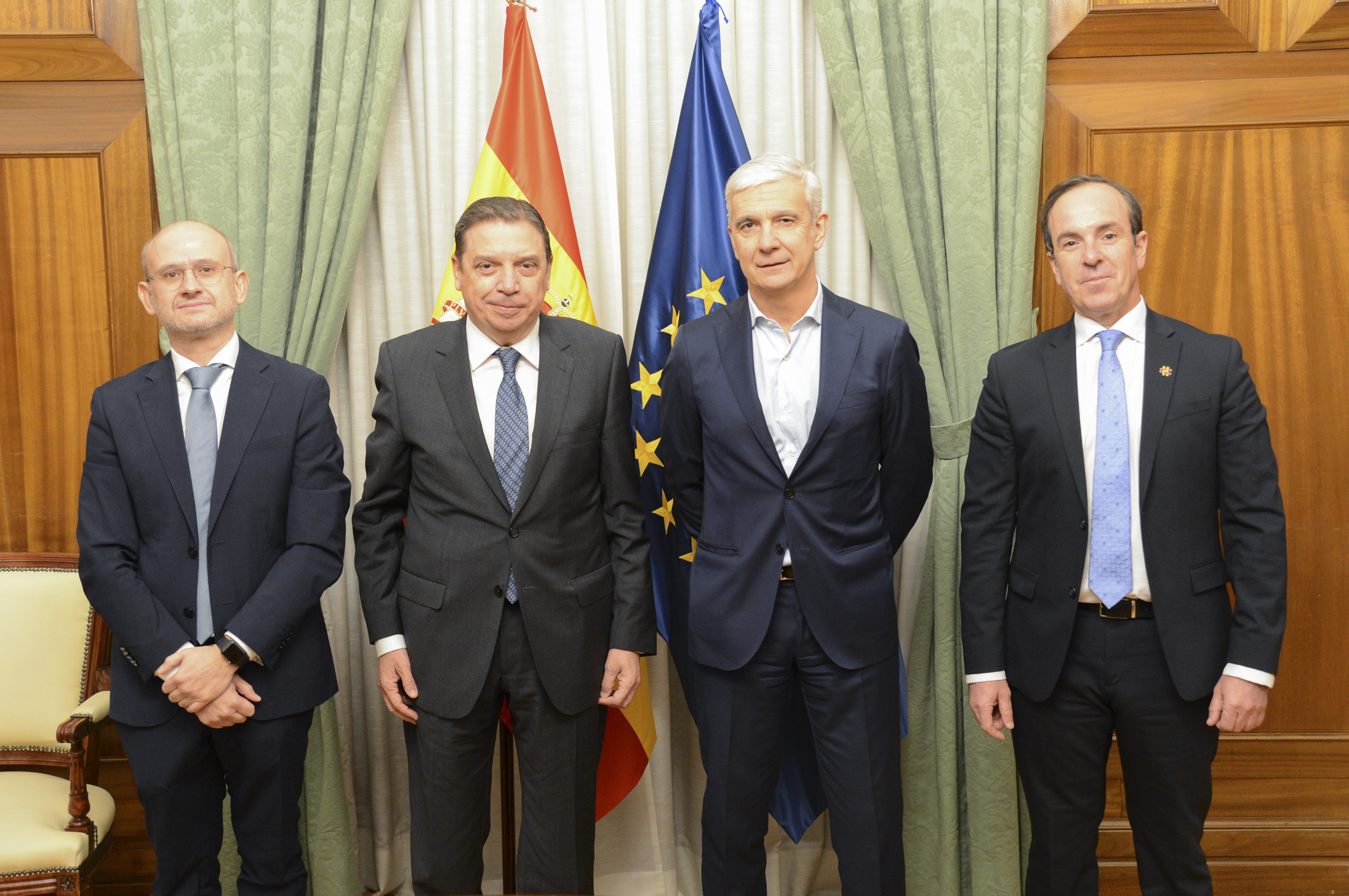 El ministro de Agricultura, Pesca y Alimentación, Luis Planas, se ha reunido hoy con el nuevo presidente de la Federación Española de Industrias de la Alimentación y Bebidas, Ignacio Silva, quienes han expresado su intención de seguir trabajando que el sector agroalimentario pueda afrontar con éxito los retos de futuro.