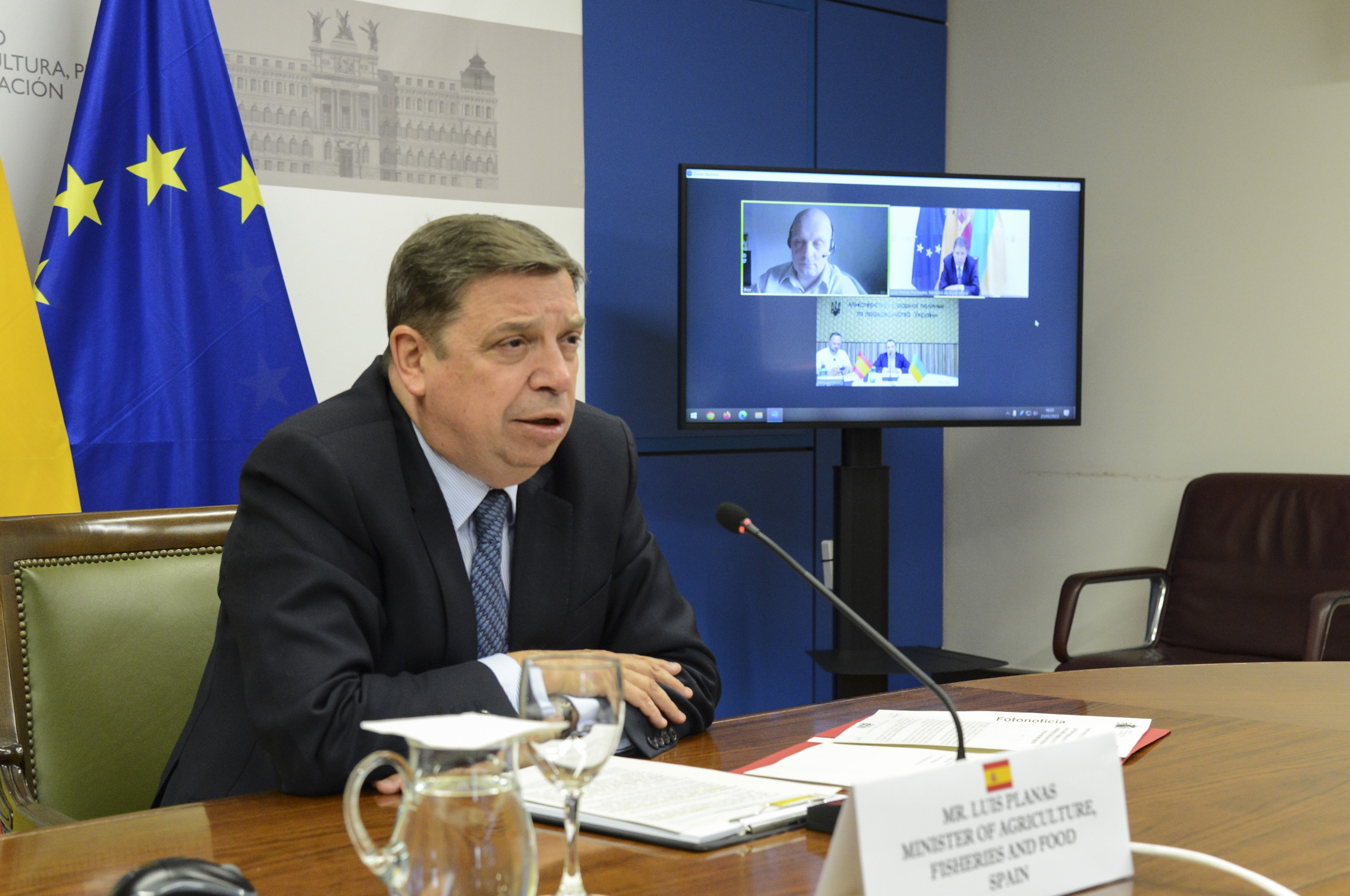 El ministro de Agricultura, Pesca y Alimentación, Luis Planas, ha trasladado hoy al ministro de Política Agraria y Alimentación de Ucrania, Mykola Solskyi, la solidaridad de España ante la injusta guerra de Rusia en Ucrania, así como su apoyo al funcionamiento regular y continuado de las exportaciones de grano procedente de aquel país.