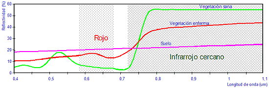 Son precisamente los dos primeros canales los que han resultado ser enormemente valiosos para el estudio de la vegetación, ya que en la región del rojo los pigmentos de las hojas absorben la mayor parte de la luz que reciben para la realización de la función clorofílica. Debido a la fuerte absorción, la vegetación sana o con fuerte vigor presenta los mínimos de reflectividad generalmente en la banda del rojo, mientras que para el infrarrojo cercano la vegetación sana o vigorosa presenta sus máximos de reflectividad. En este principio se basan la mayoría de los llamados "índices de vegetación" que combinan la banda roja del visible con la del infrarrojo cercano. Quiere esto decir que cuanto mayor sea la diferencia entre los valores de estos dos canales espectrales mayor vigor presentará la cubierta vegetal observada y viceversa.