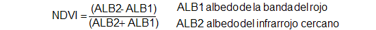 El índice de vegetación utilizado en el presente estudio es el conocido como NDVI (Normalized Difference Vegetation Index) o "Índice de Vegetación Normalizado", cuya expresión es: