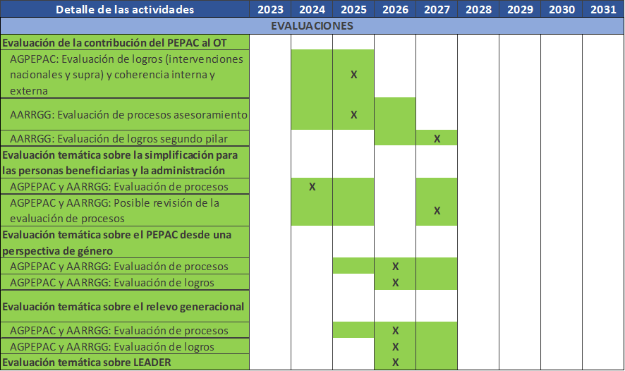 • Las evaluaciones ex ante, intermedias y posteriores, así como todas las demás actividades de evaluación del PEPAC.