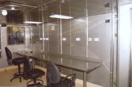 Está dotado de una mesa de trabajo, de alimentación eléctrica de 230V y 24V, servicios de agua caliente y fría, aire comprimido, agua salada y un fregadero. Las paredes son de acero inoxidable.