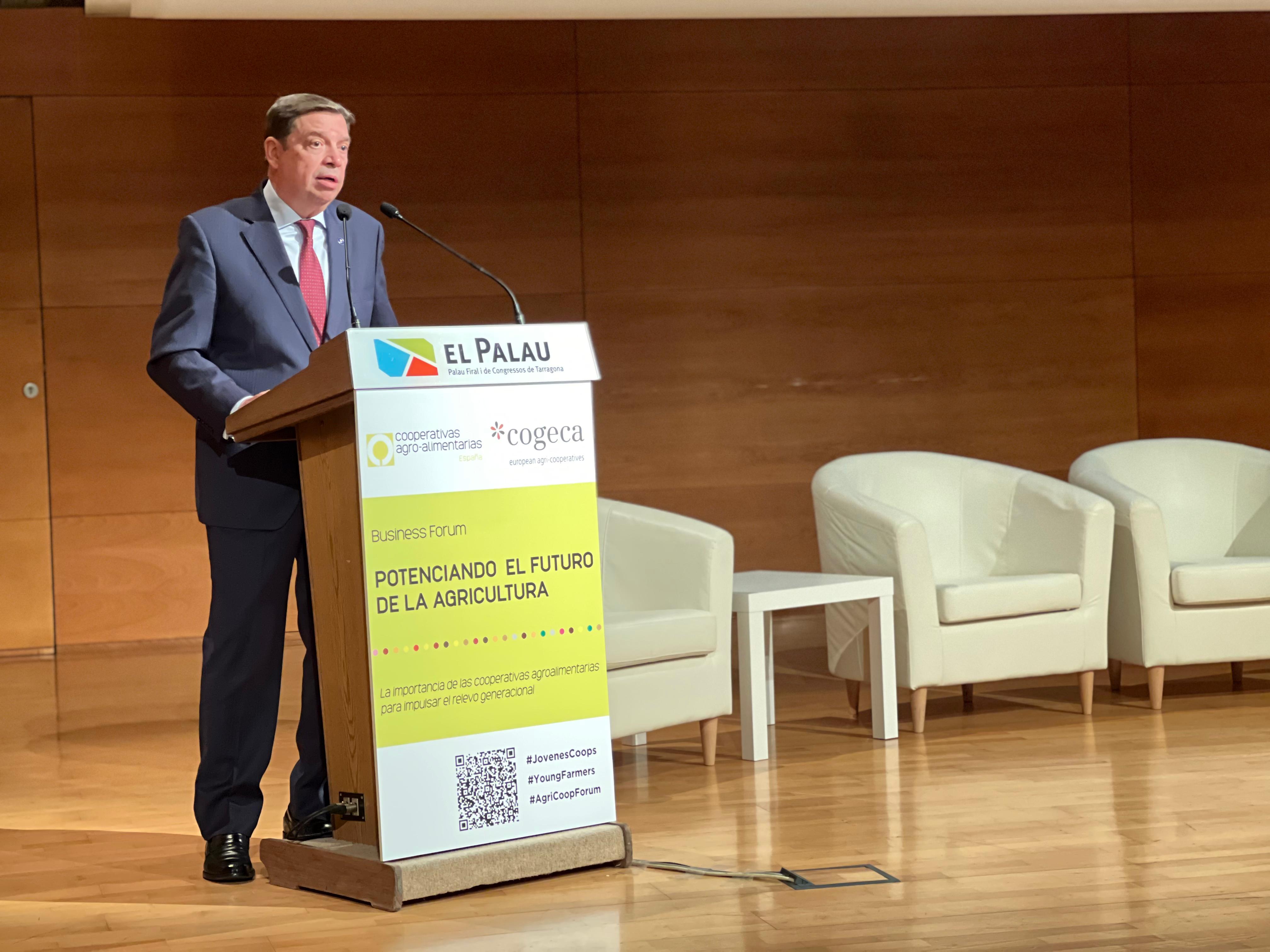 Luis Planas ha participado en la inauguración del Foro Empresarial de la Presidencia de la Confederación General de Cooperativas Agrícolas (COGECA) “Potenciando el futuro de la agricultura. La importancia de las cooperativas agroalimentarias para impulsar el relevo generacional”, que tiene lugar en Tarragona los días 9 y 10 de noviembre. Este acto, que se enmarca en las actividades de la Presidencia española del Consejo de la Unión Europea (UE), reúne estos días a un total de 250 cooperativistas, la mayoría jóvenes.
