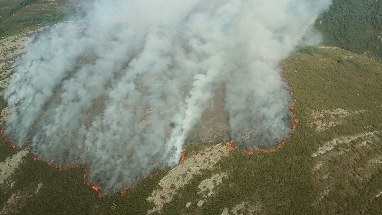 Nueve medios aéreos del Ministerio de Agricultura, Pesca y Alimentación y dos Brigadas de especialistas en extinción trabajan en el incendio declarado en Vilariño de Conso (Ourense)