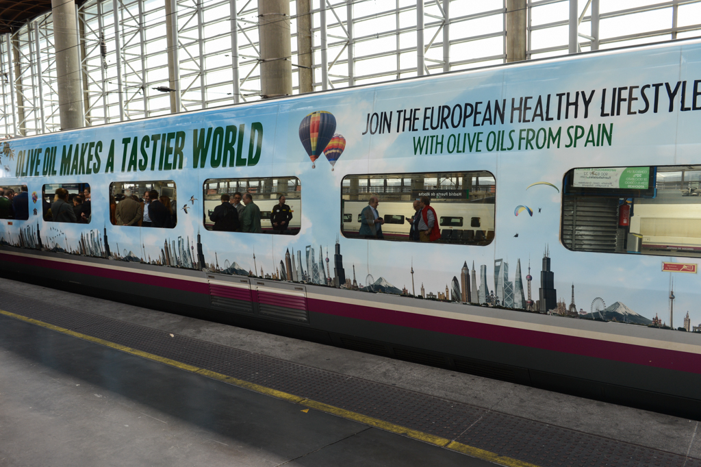 Como parte de esta iniciativa, los coches y locomotoras de uno de los trenes de alta velocidad se han vinilado con la imagen de esta campaña, así como el interior de las cafeterías de todos los AVE que unen las ciudades de Madrid y Sevilla. La campaña se completará con la entrega de miles de muestras de aceites de oliva virgen extra a los pasajeros que realizan este trayecto cada día.
