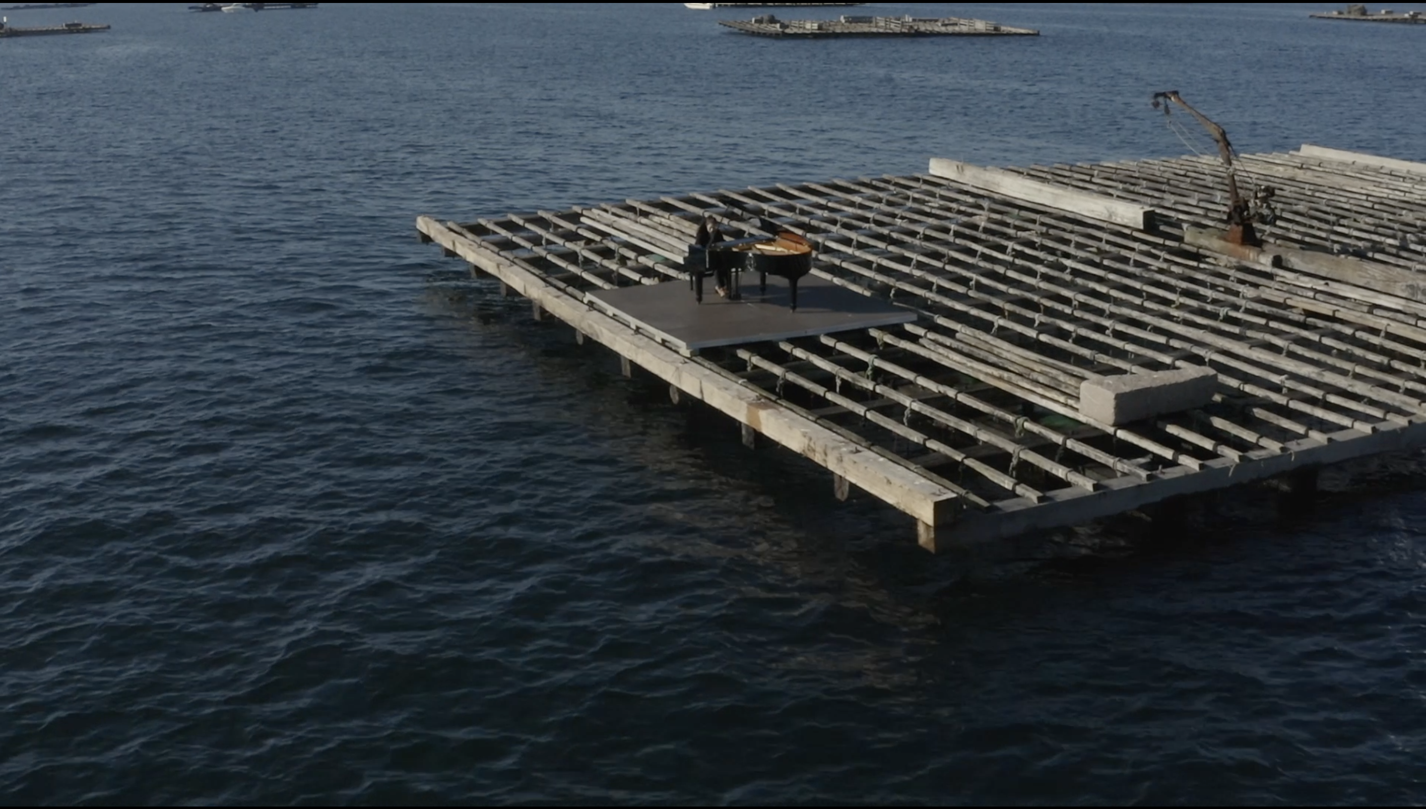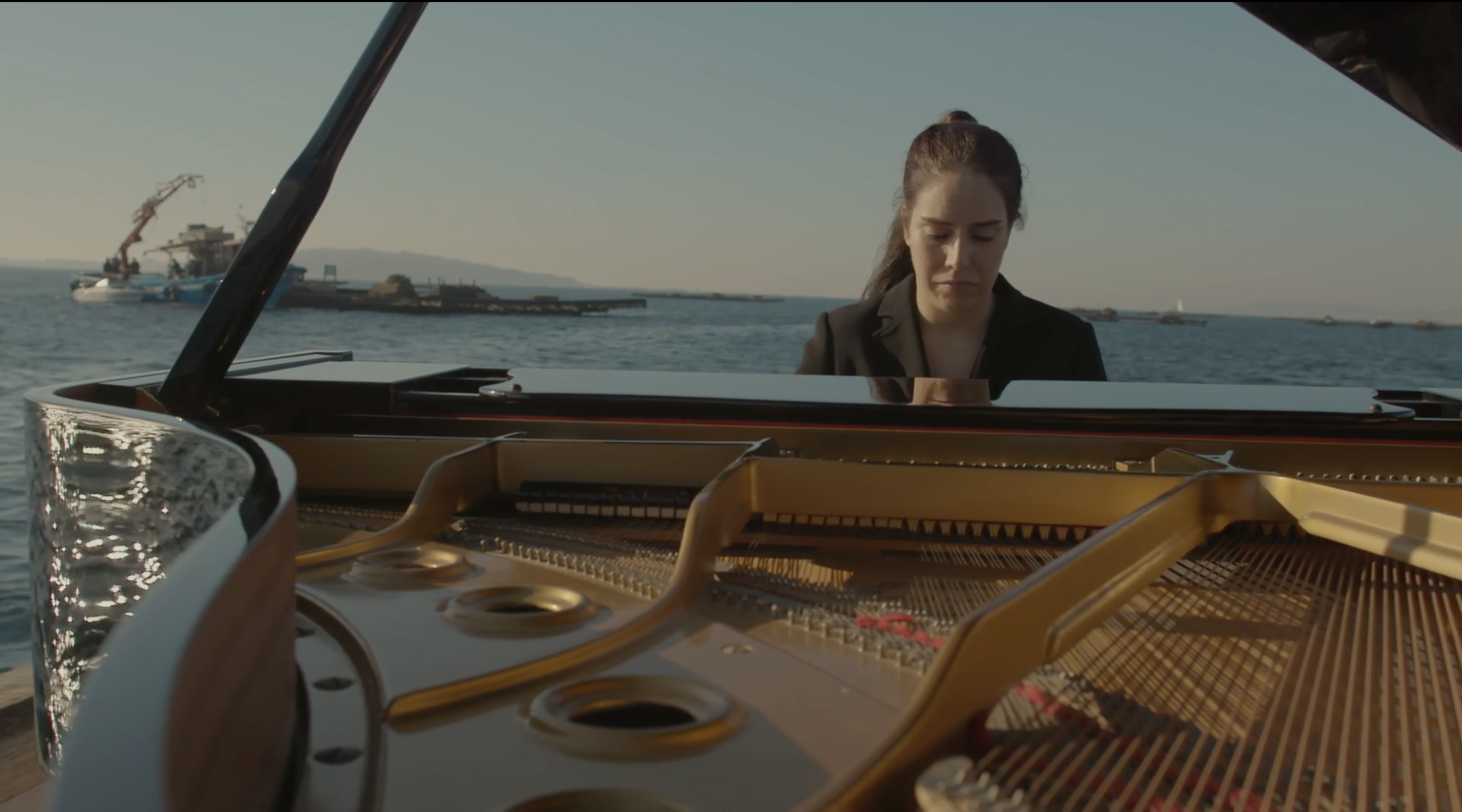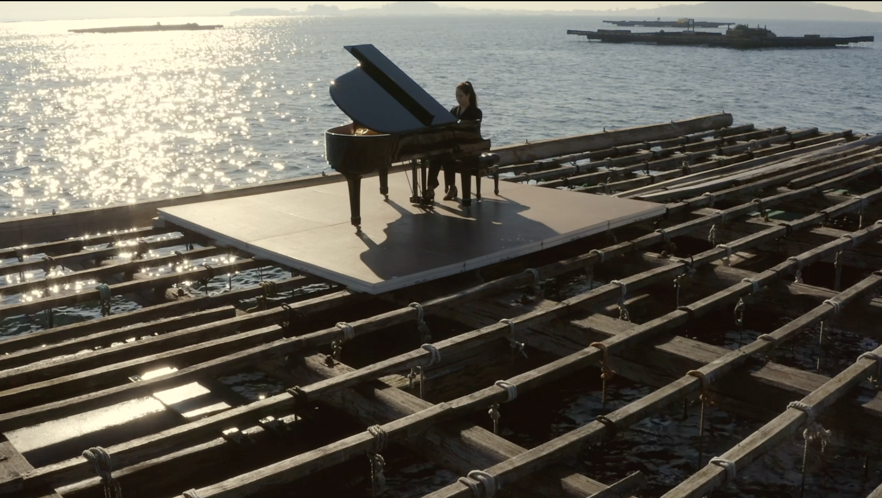La originalidad del aspecto visual de Presentimiento radica en su escenificación por lo sorprendente que resulta la vinculación entre un piano de cola y una batea sobre el mar. El nexo entre el instrumento musical y la plataforma para la producción de moluscos es la artista Elsa Muñiz, cuyo padre, ya fallecido, se dedicaba a la profesión pesquera.