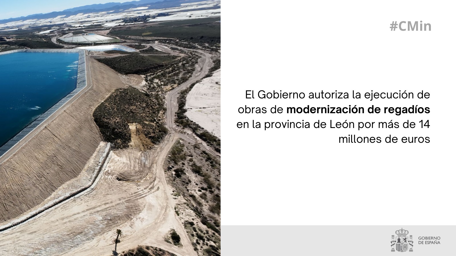 El Consejo de Ministros ha autorizado al Ministerio de Agricultura, Pesca y Alimentación (MAPA) la suscripción de un encargo a la Empresa de Transformación Agraria (Tragsa) para la ejecución de obras de modernización de regadíos en la provincia de León, con un presupuesto total que supera los 14,1 millones de euros (sin IVA).