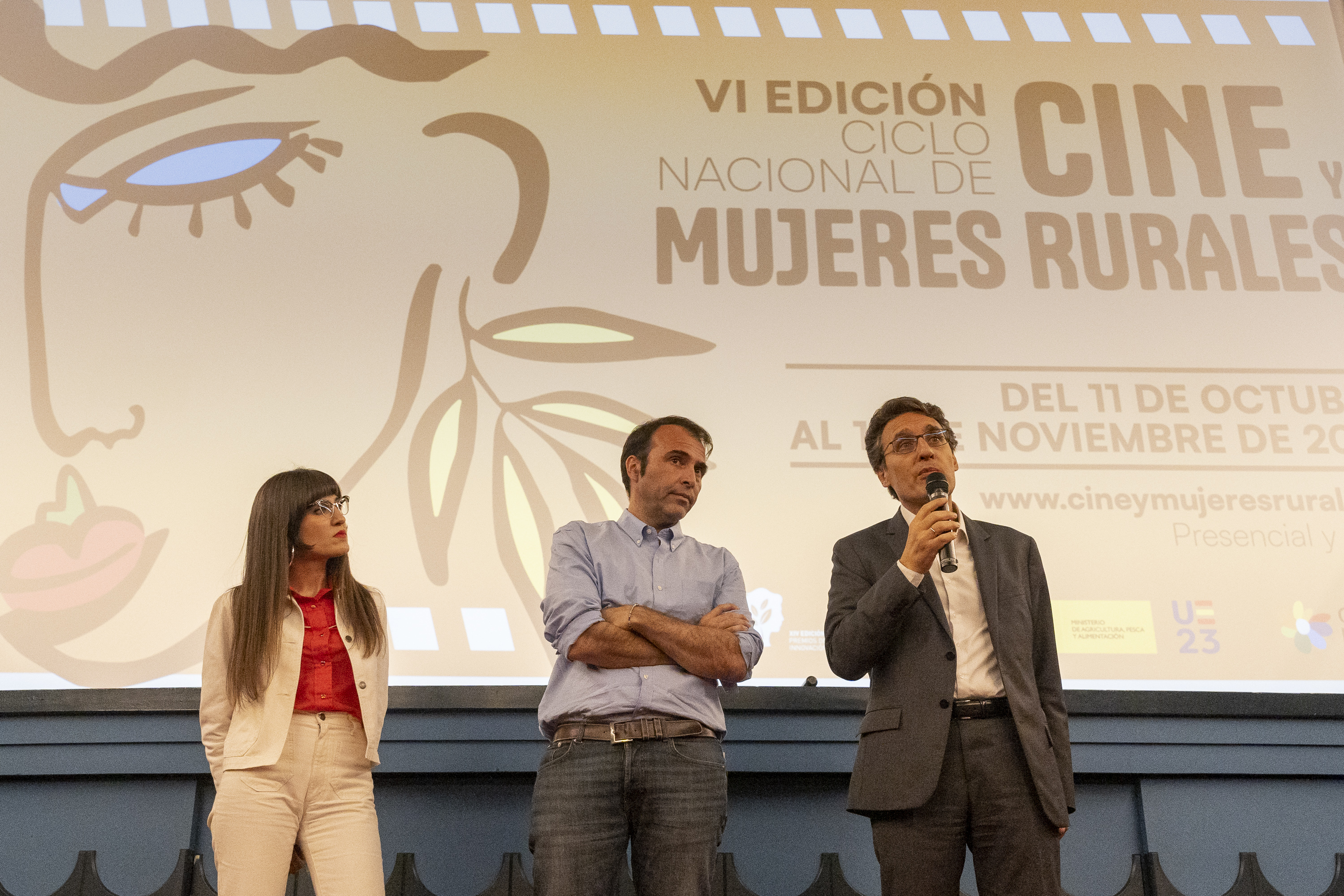 El secretario general de Agricultura y Alimentación, Fernando Miranda, ha presidido hoy el comienzo de la VI Edición del Ciclo Nacional de Cine y Mujeres rurales, que ha tenido lugar en el madrileño cine Doré, de la Filmoteca Española. Miranda ha estado acompañado del subdirector general de Cooperación Cultural con las Comunidades Autónomas, Benito Burgos, y de la directora granadina Rocío Mesa, cuya película Secaderos ha abierto el ciclo de proyecciones, que finalizará el próximo 18 de noviembre.