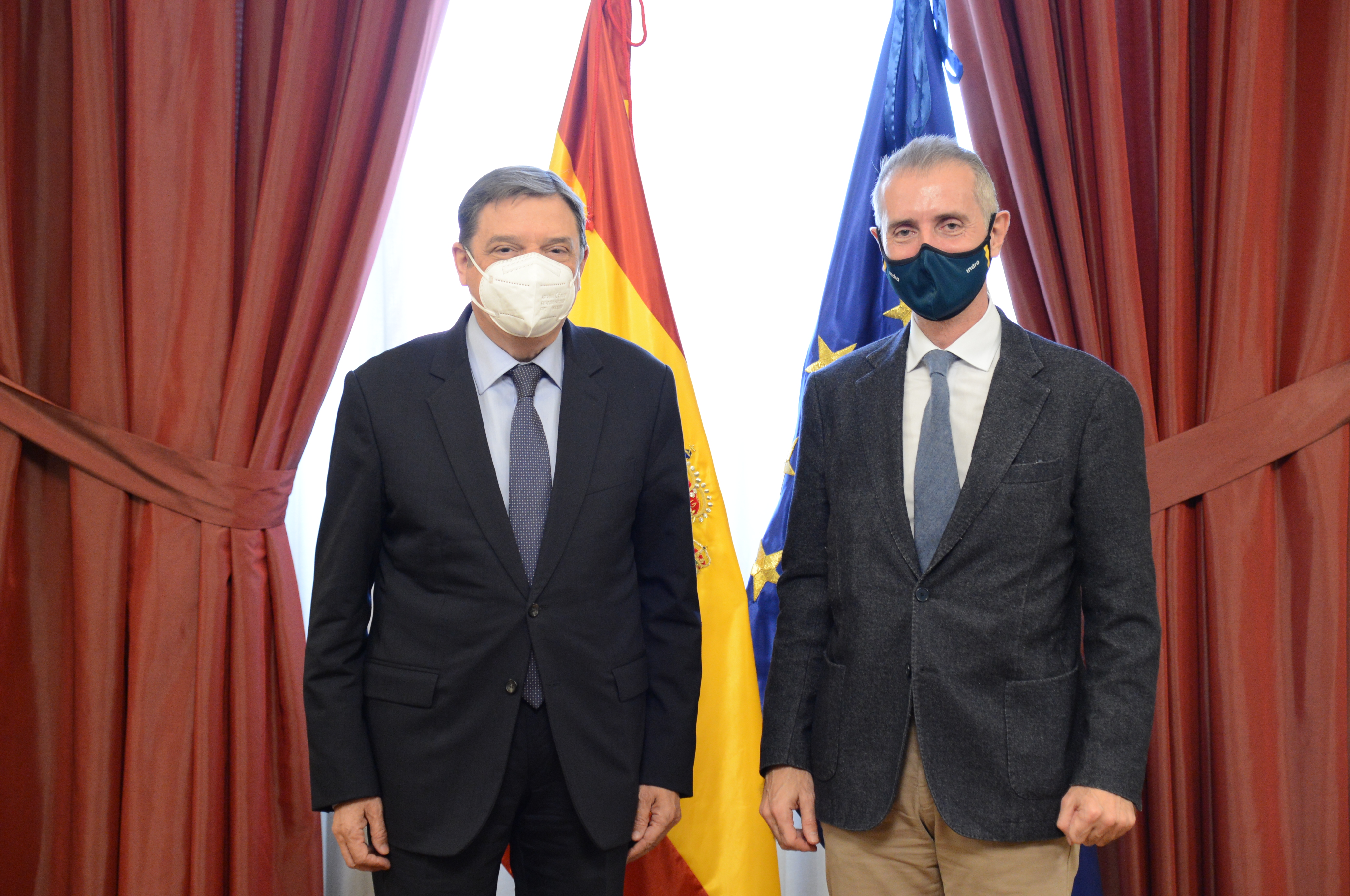 El ministro de Agricultura, Pesca y Alimentación, Luis Planas, se ha reunido hoy con el presidente de Indra, Marc Murtra, con quien ha pasado revista a las iniciativas planteadas por esta sociedad dentro del Plan de Recuperación, Transformación y Resiliencia de España en relación con la digitalización del sector agroalimentario.