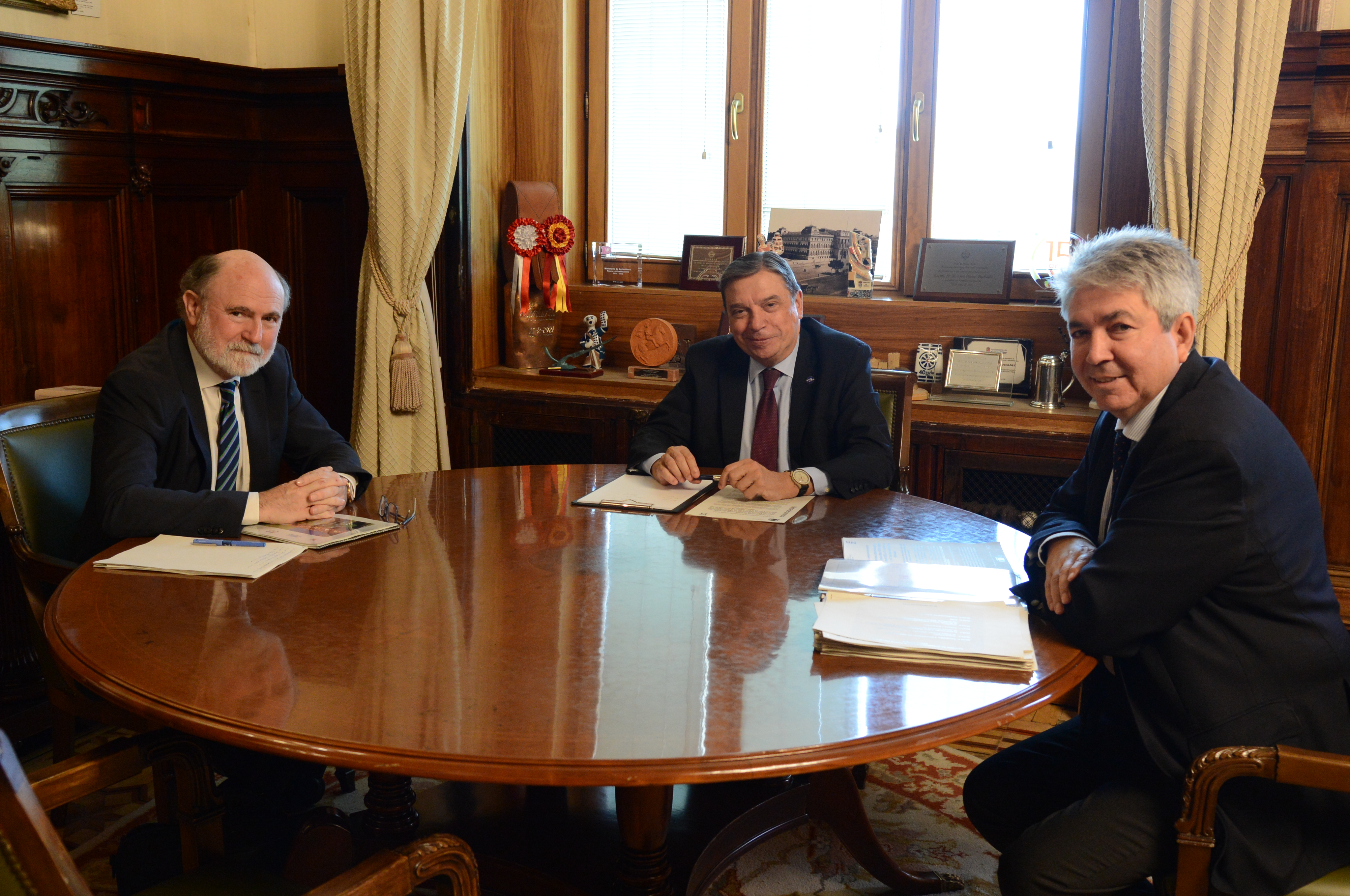 El ministro de Agricultura, Pesca y Alimentación en funciones, Luis Planas, se ha reunido hoy, en la sede del ministerio, con el presidente del Grupo Tragsa, Jesús Casas, para tratar temas de interés común. El Grupo Tragsa, tutelado por el Ministerio de Agricultura, Pesca y Alimentación y de capital social íntegramente público, forma parte de la Sociedad Estatal de Participaciones Industriales (SEPI) y del Sector Público Institucional. Con presencia en todas las provincias españolas, esta entidad ofrece soluciones integrales centradas en la mejora y conservación de los espacios naturales y la biodiversidad.