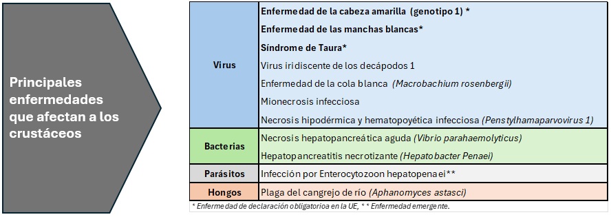 El reglamento de ejecución (UE) 2018/1882 establece un listado y categorización de enfermedades para su control en la Unión Europea. En los crustáceos están incluidas: la infección por el virus del síndrome de las manchas blancas (WSSV), categorizada como C+D+E, la infección por el virus de la cabeza amarilla (YHV) y la infección por el virus del síndrome de Taura (TSV), categorizadas como A+D+E.