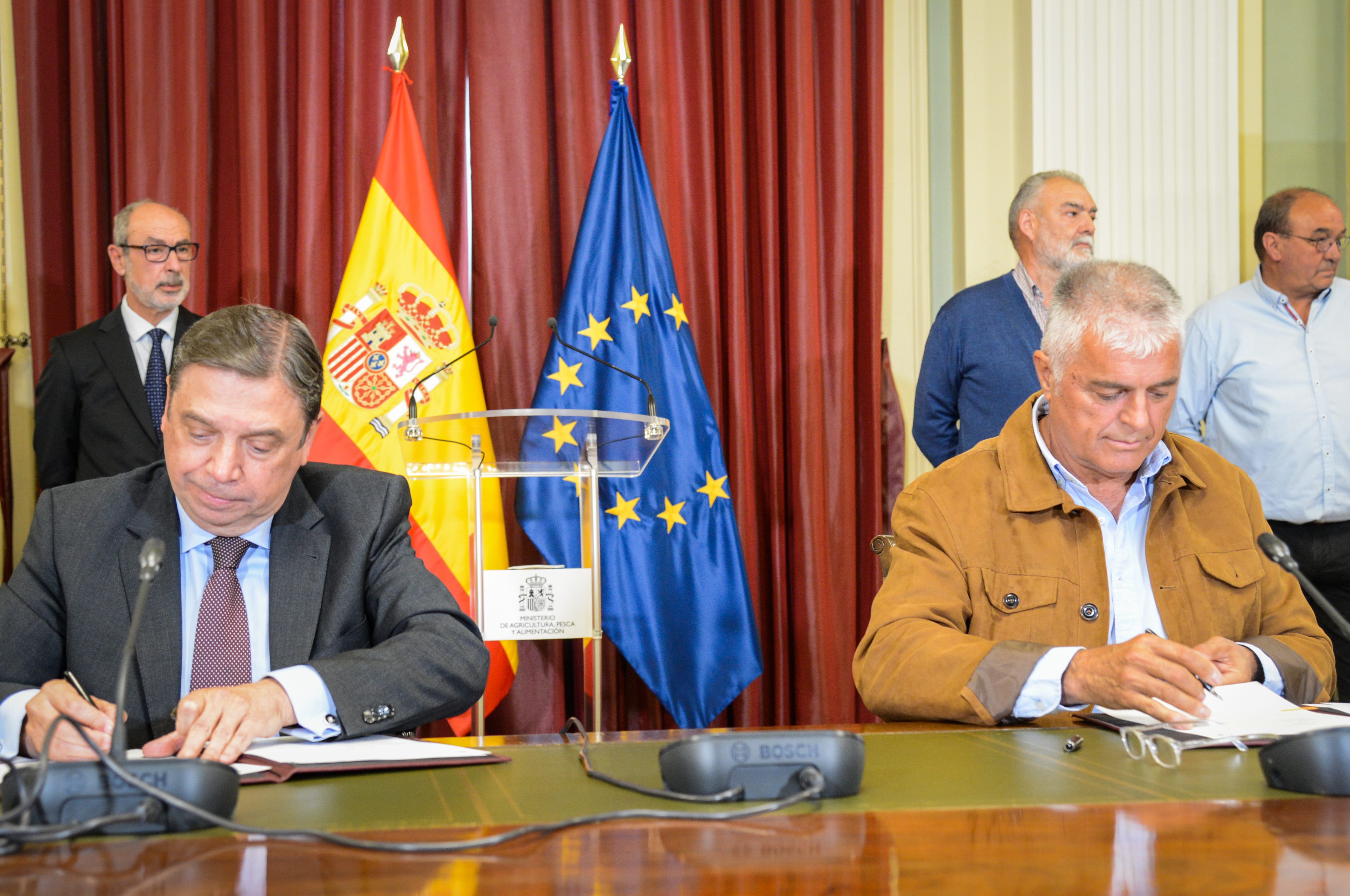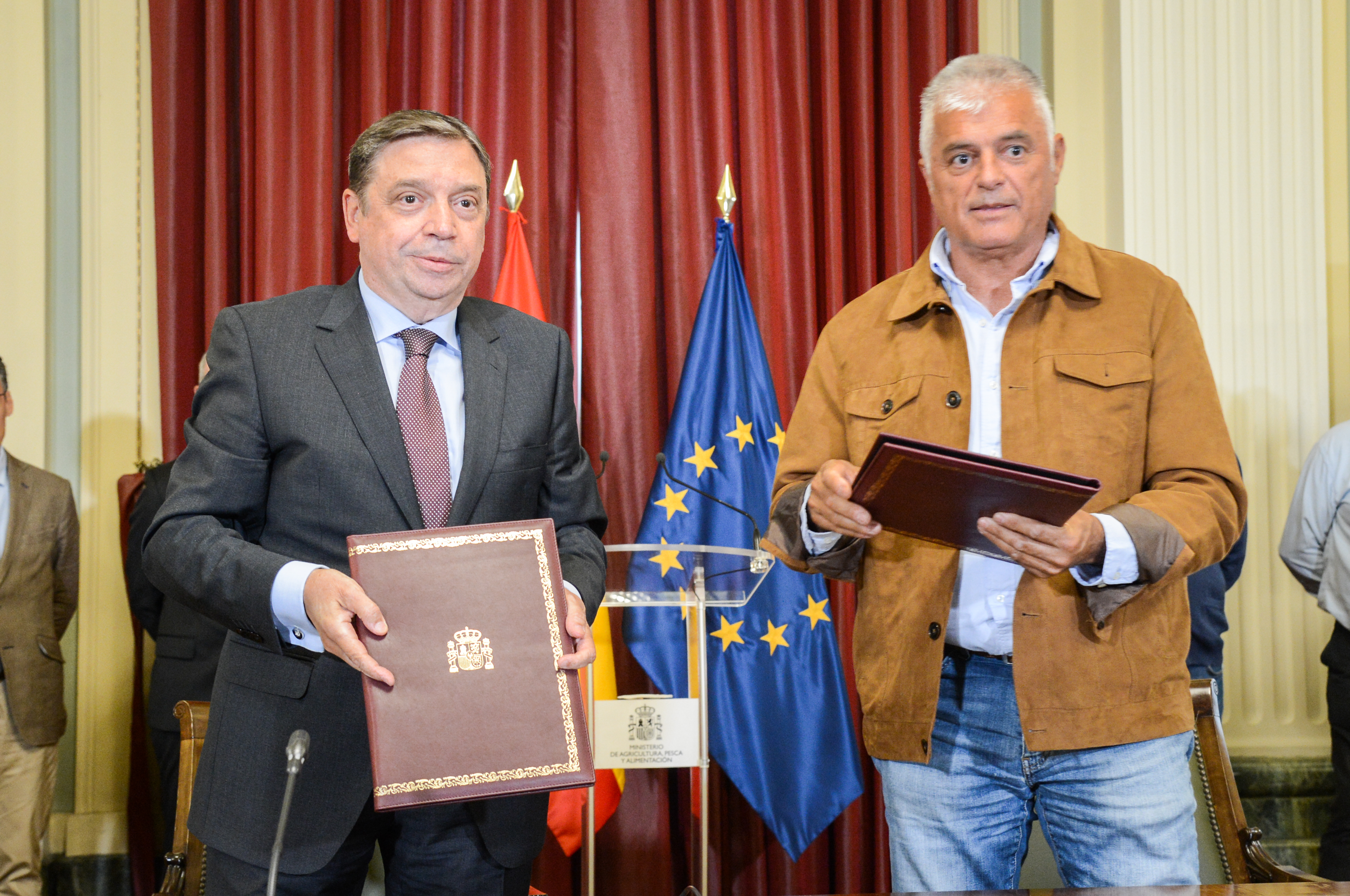 El ministro de Agricultura, Pesca y Alimentación, Luis Planas, y el coordinador estatal de Unión de Uniones de Agricultores y Ganaderos, Luis Cortés, han firmado hoy el acuerdo sobre las 43 medidas propuestas por el Gobierno para dar respuesta a las preocupaciones que los agricultores y ganaderos han expresado en las movilizaciones que han mantenido en las últimas semanas.